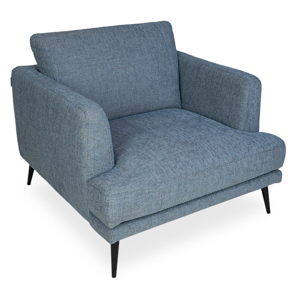 Inspired by Nordic vintage style, the Sophia Chair features a minimalist design with clean lines, a wide cushion, and slim, tapered black metal legs. The variegated blue and grey fabric is chic and sophisticated, and its neutral color complements the chair's understated look. Sophia is the perfect choice for adding retro flair to your living room.