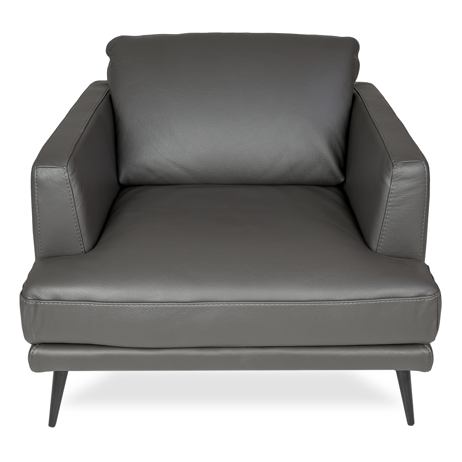 Inspired by Nordic vintage style, the Sophia Chair features a minimalist design with clean lines, a wide cushion, and slim, tapered black metal legs. The dark grey leather is chic and sophisticated, and its neutral color complements the chair's understated look. Sophia is the perfect choice for adding retro flair to your living room.