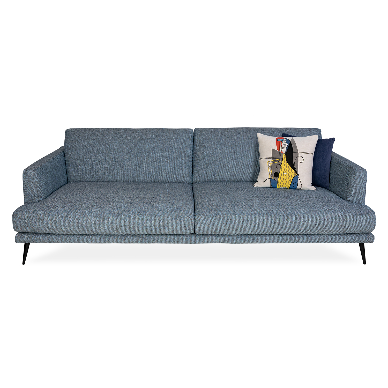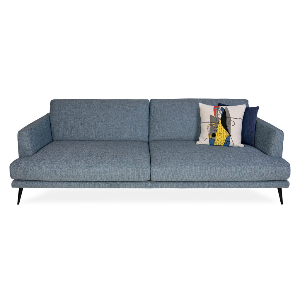Inspired by Nordic vintage style, the Sophia Sofa features a minimalist design with clean lines, wide cushions, and slim, tapered black metal legs. The variegated blue and grey fabric is chic and sophisticated, and its neutral color complements the sofa's understated look. Sophia is the perfect choice for adding retro flair to your living room.