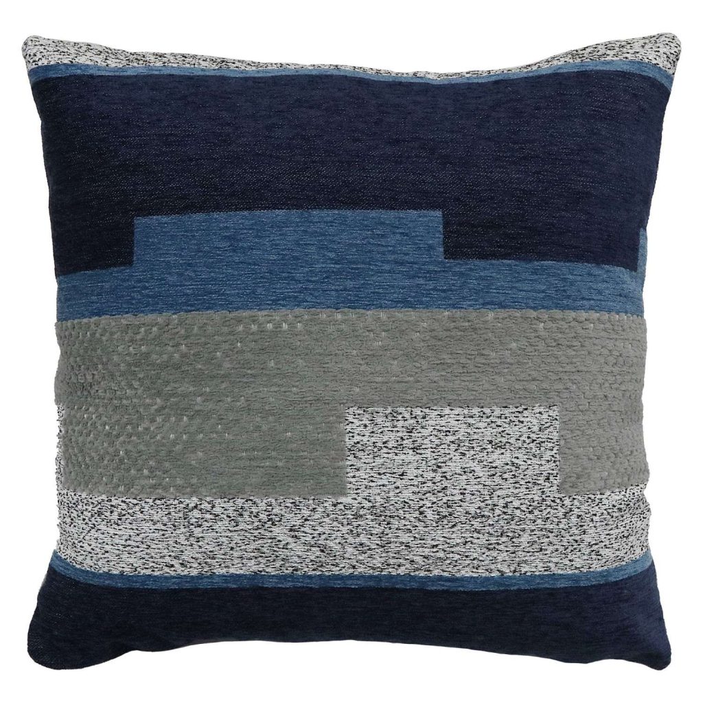The Sphinx Pillow features a geometric striped design in tones of blue, grey, and off-white. Smoother sections with a velvety feel contrast with raised sections that have a lightly knobbled, fuzzy texture. A feather filling gives this pillow a satisfying plumpness, while a discreet zipper allows the cover to be removed for spot-cleaning if needed.