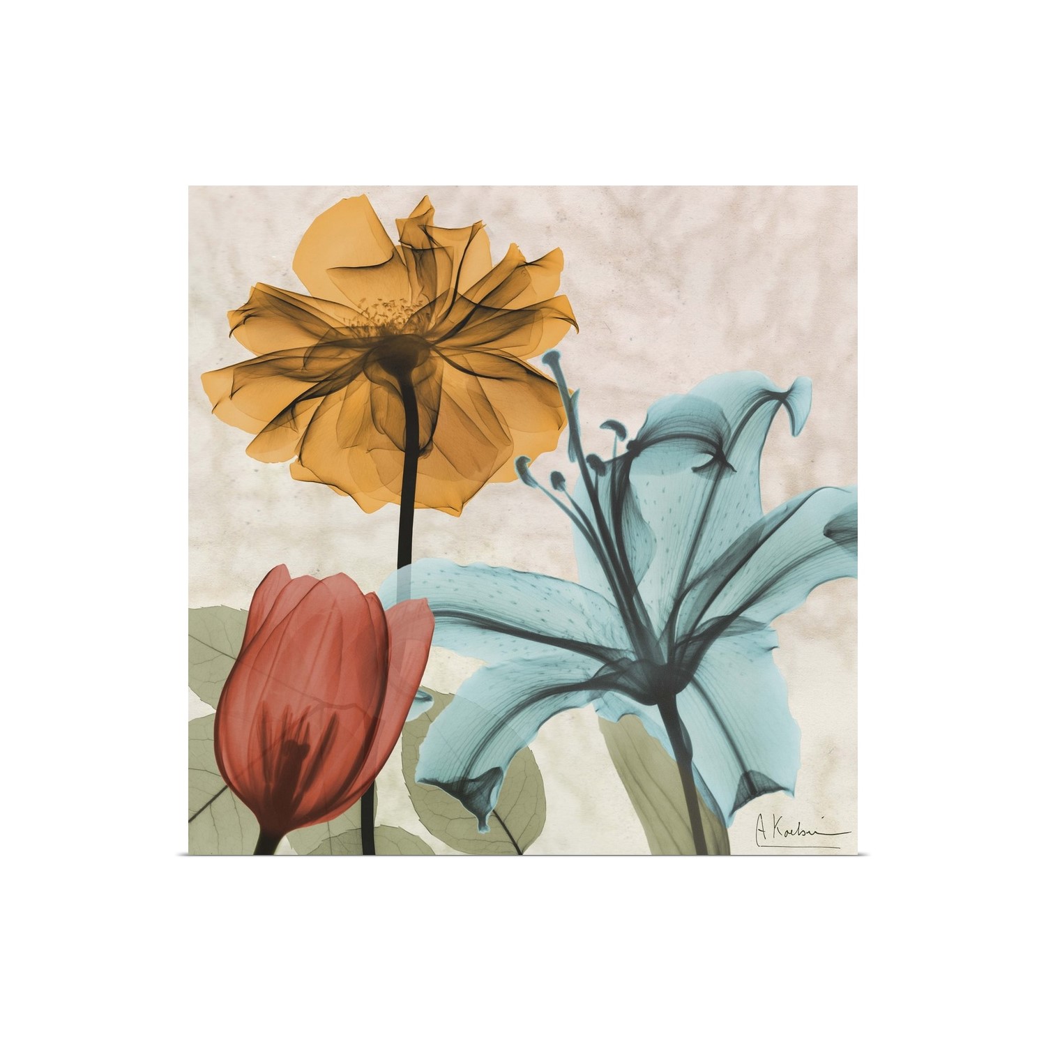 Add a pop of color and bring nature indoors with the Spice Avalon Wall Art, by Albert Koetsier. This eye-catching piece shows an x-ray photograph of three flowers - an orange rose, blue lily, and red tulip - against a muted blue background. A glossy surface is the finishing touch on this artwork that will jazz up any plain wall.