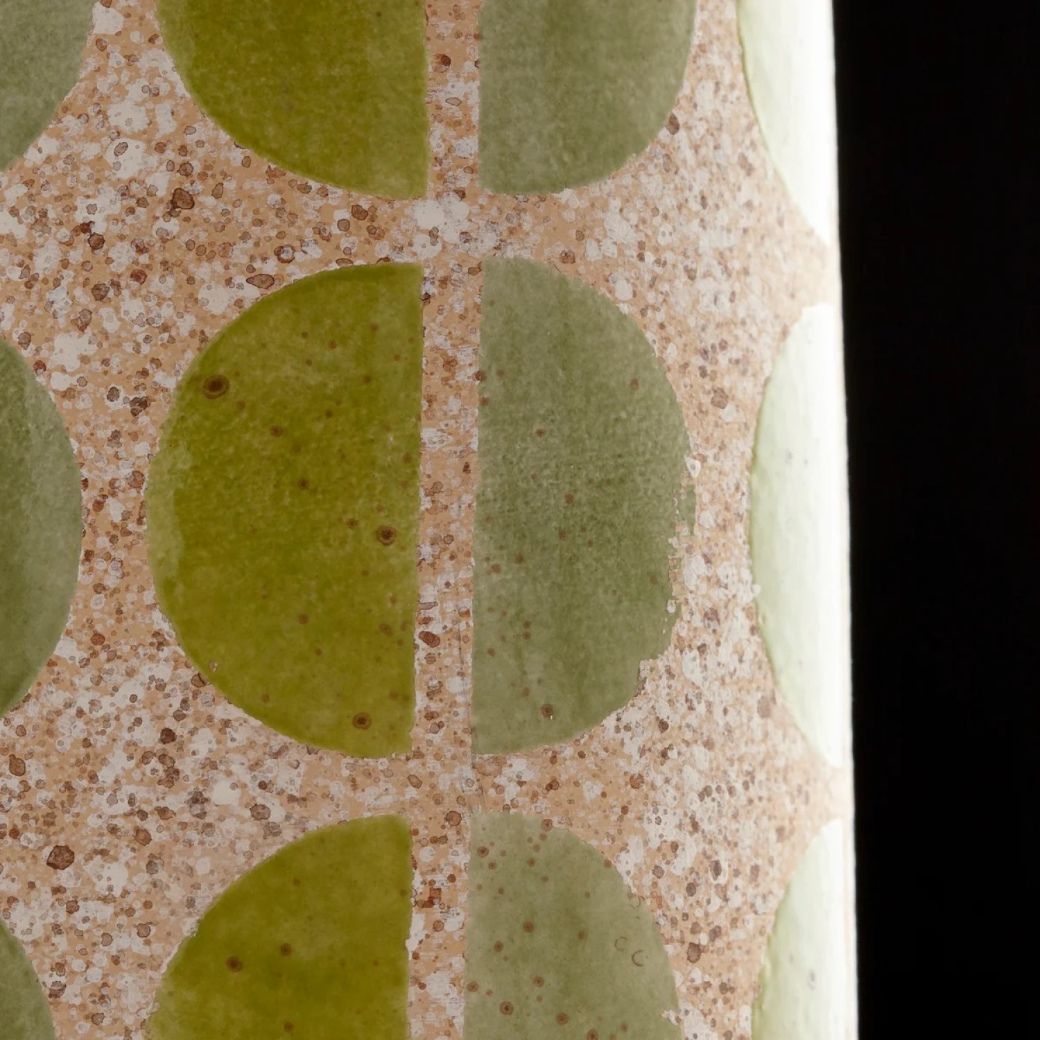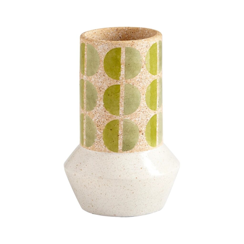 The Spruce Vase features a tulip silhouette and a decorative, circular pattern in green on a speckled brown background. The bottom of the vase is painted in soft white, which allows the pattern to shine. Place the Spruce Vase on your table, counter, or shelf to add a subtle pop of color to any space.