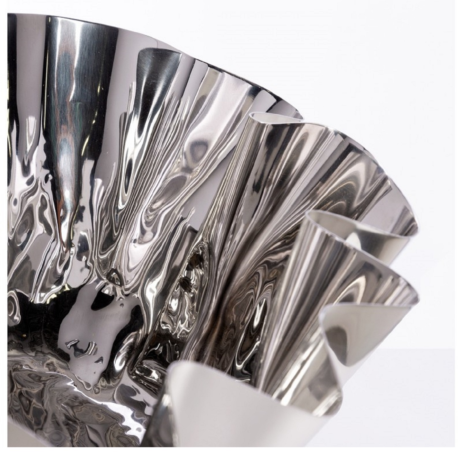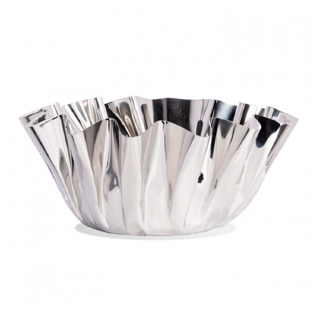 The Stainless Steel Small Bowl has a reflective, polished finish and a contemporary look with a wavy silhouette reminiscent of folded paper. Handcrafted and outdoor-friendly, this bowl is an ideal accent piece for both your living room and your patio. Hand wash only.
