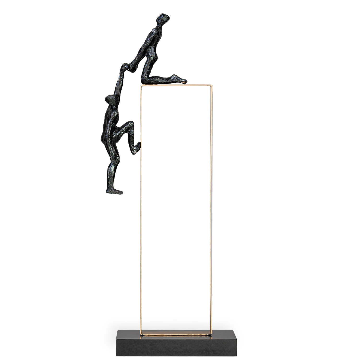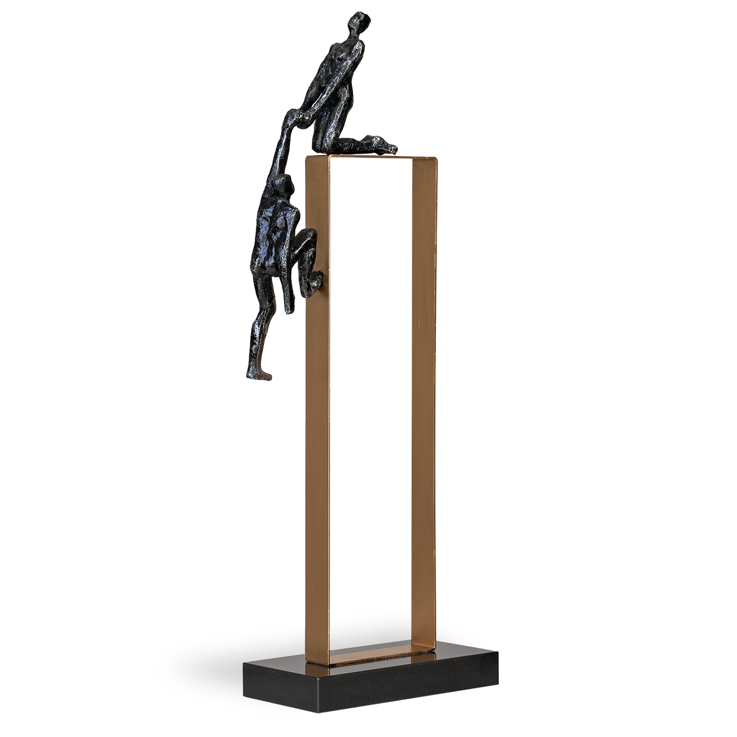 The Stamina Sculpture features two figures balanced in dynamic poses on a brass rectangular frame. Both made of resin with a hand-painted silver finish, one figure kneels on top of the frame, helping the other to climb up the side. A black stone base makes this sculpture ready to display on any tabletop, desk, or bookshelf.