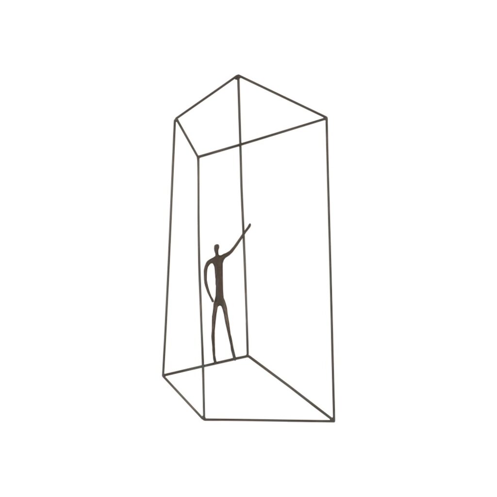 [0] => The Standing Perspective Wall Art features a figure of a person waving in an asymmetrical rectangular wire cage, with morphed angles and a manipulated perspective that plays with the eye. Whether displayed by itself or alongside the other items in the Perspective collection, this decorative wall structure will bring a chic, three-dimensional element to any home.