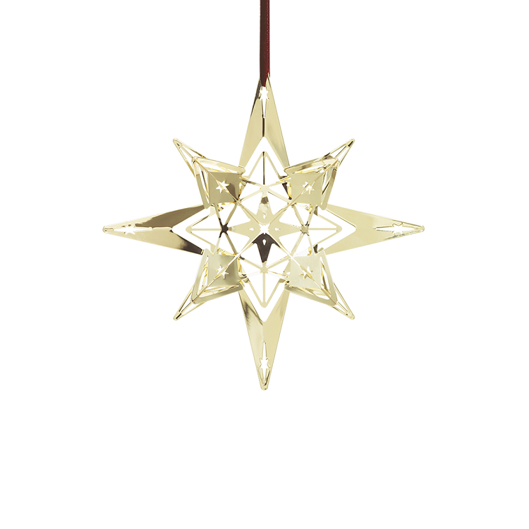 [0] => The Star hanger in scintillating gold-plated metal features a contemporary 'fairy-tale' Christmas design based upon traditional Danish decorations. The hanger has a beautiful burgundy velour ribbon that can be used to hang the ornament from a pine bough, on a Christmas tree, in a window, or tied in a holiday wreath.