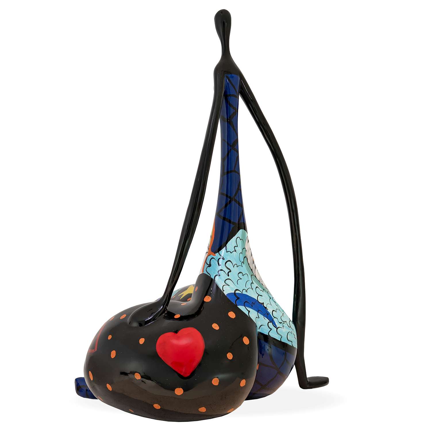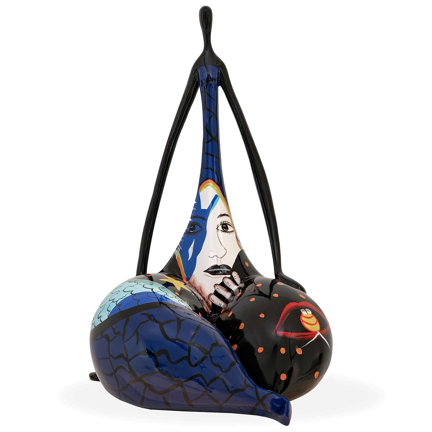 Made of polyresin with a glossy finish, the Star Lady Sculpture depicts the stylized figure of a woman sitting with her legs crossed. This sculpture is painted in shades of blue and black, reminiscent of a night sky, with a number of creative patterns and images applied around the body, including a woman's face, a star, a heart, a mouth, polka dots, a cloud-like pattern, and a net-like pattern. Star Lady is ideal for adding artistry to any modern interior.