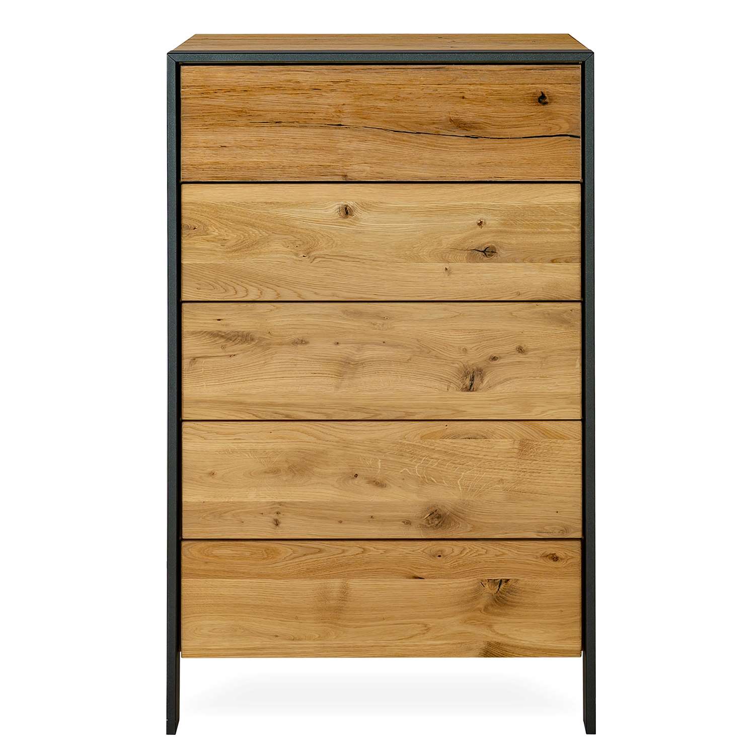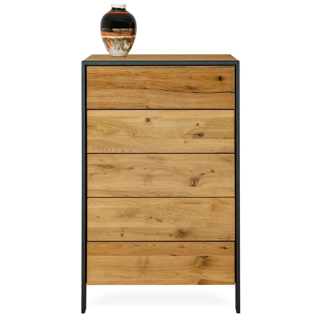 Designed in Germany with precision engineering and an eye for style, the Steel 5-Drawer High Chest presents a harmonious blend of natural textures and modern functionality. Light and warm tones of brushed wild oak are offset by matte black metal accents, with the organic, dimensional wood texture of the top drawer forming a focal point. Five push-to-open drawers and a compact form offer space-savvy storage, while LED lighting over the top drawer provides handy illumination for quickly locating items. Pair with the matching Steel bed, nightstand, and double dresser for a boldly original bedroom setup.