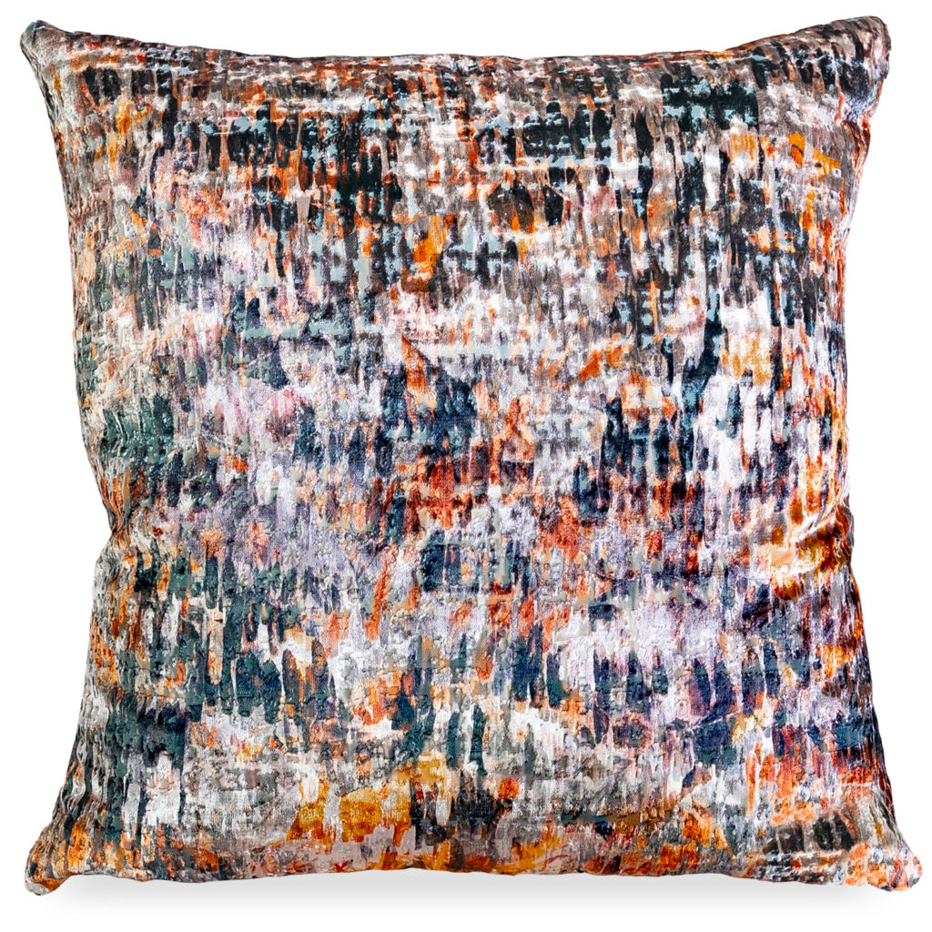 [0] => The Storm Sienna Pillow features an impressionistic, double-sided pattern in navy blue, orange, yellow, and grey, plus a silky feel with a high-low texture. This pillow is filled with a voluminous feather and down mix that lets you fluff it to a satisfying thickness. A bottom zipper with a gold finish and an ornamental pull charm lets you easily remove the cover for dry-cleaning.