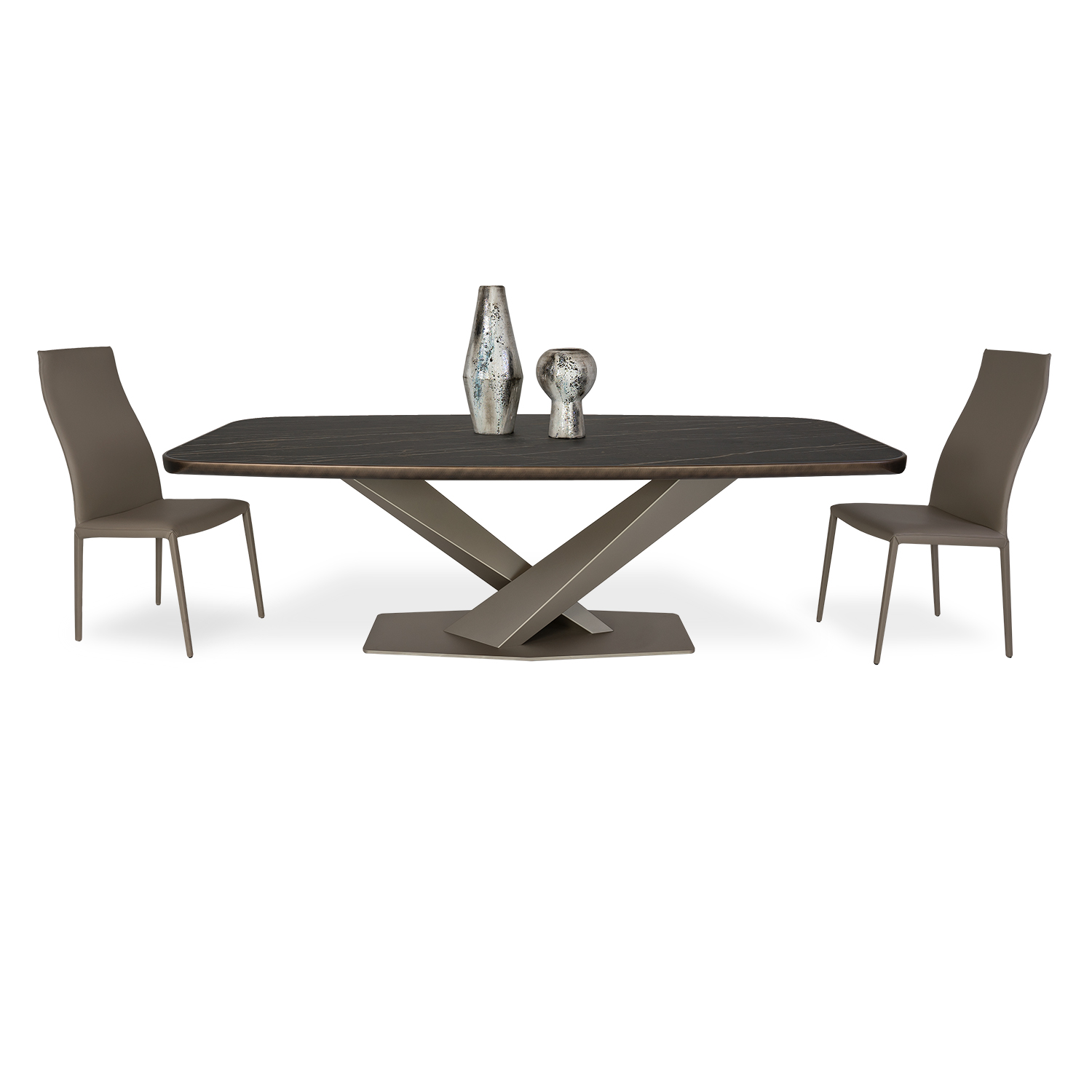 The Stratos Dining Table features a matte ceramic marble top, a brushed bronze profile on the tabletop's edge, and a sculptural base in titanium embossed steel. Stratos' two triangular legs are striking with their bold, crossed design and industrial-inspired shape. Earth-toned veins in the dark grey ceramic marble top add visual texture and a luxurious look to this showstopper of a piece.