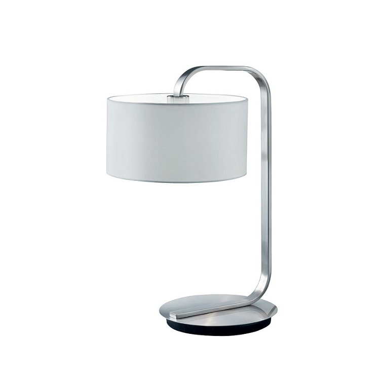 The Stratus Table Lamp, available with a chrome frame and white lampshade, features clean, modern design with rounded curves and simple style.