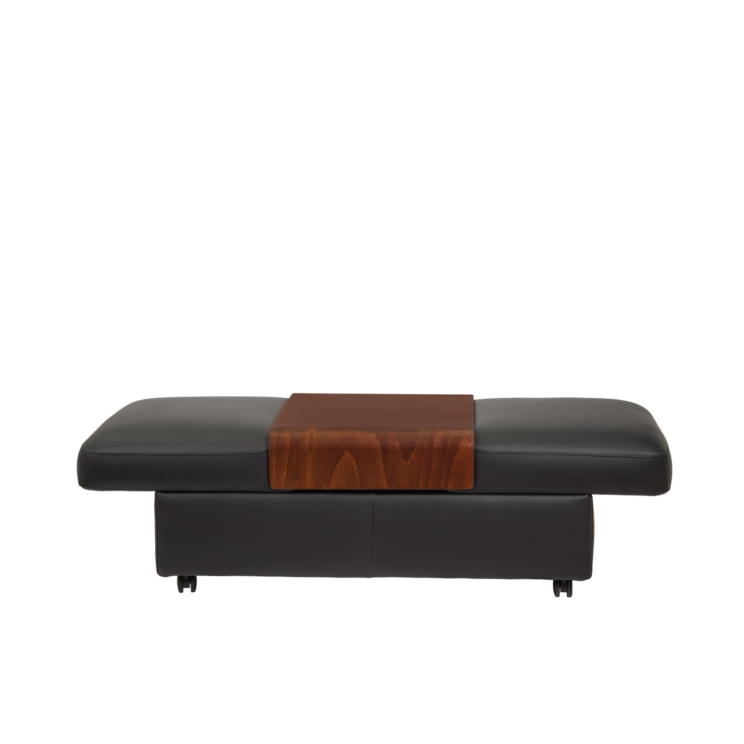 The Stressless Double Ottoman and Table features soft black Paloma leather, wheels for mobility, and a sleek fitted table in a brown stain, providing you with even more room to relax. The versatility of this ottoman means that it can both hold your drink and increase your comfort in the seated or reclined position by ensuring the proper alignment of the legs and feet.