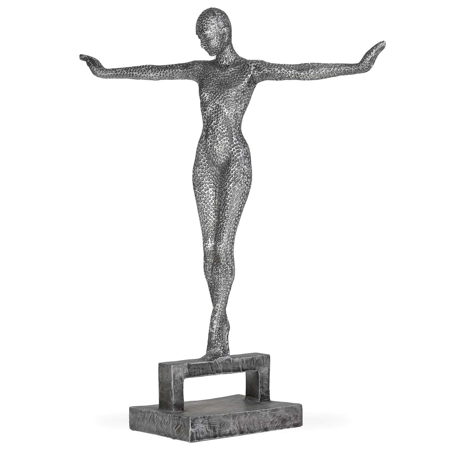 The Stretched Out Hand Sculpture depicts a figure with their arms outstretched to either side, standing on tiptoe on a beam-like structure. A dotted pattern covers the body of the statue, adding a sense of texture and an edgy, avant-garde twist. Made of aluminum, the Stretched Out Hand Sculpture comes with a rectangular base and is suitable for indoor or outdoor use.
