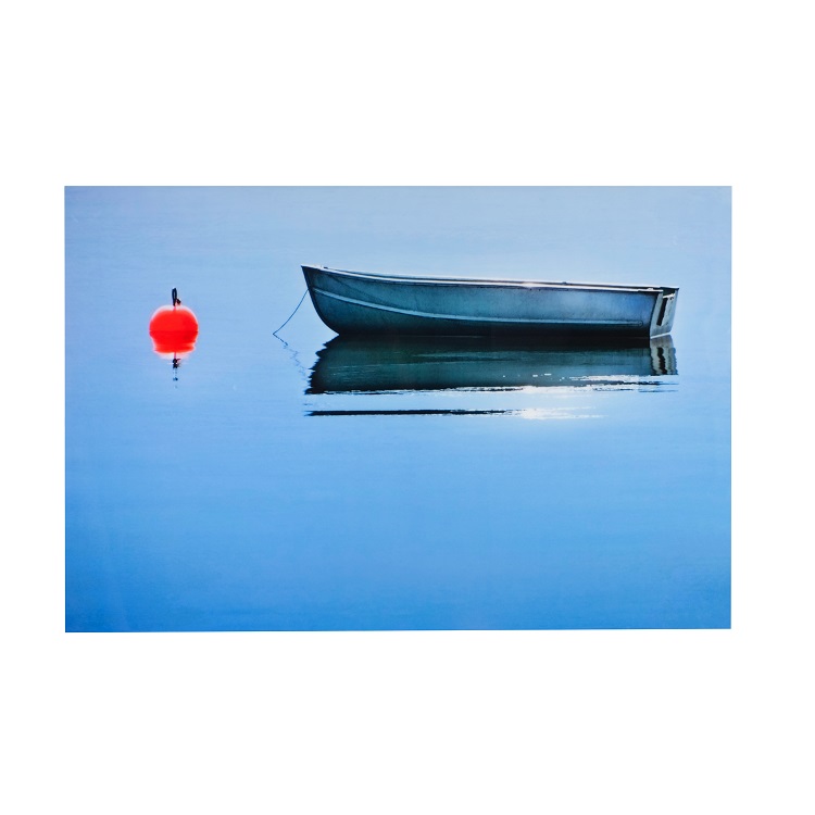 The Summer Boat wall art rejoices in the beauty of a solitary floating boat, its reflection scintillating and swimming on the water's surface. The red buoy adds a pop of color to the deep ocean blue color palette.