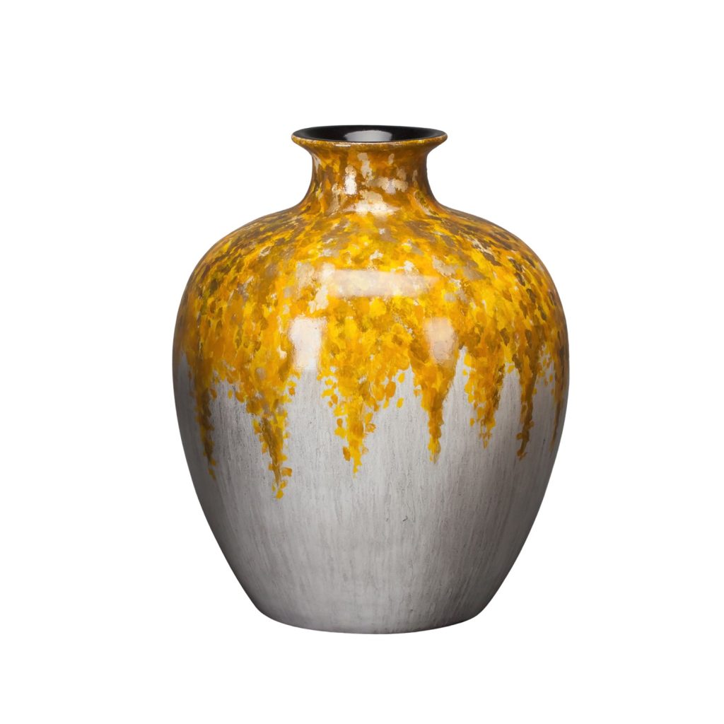 [0] => The Summerlin Vase is crafted from porcelain with an off-white glaze and features a hand-painted design of yellow, orange, and brown specks over the vase's upper half. Its autumnal color scheme and classical rounded urn shape makes Summerlin ideal for showing off seasonal foliage or displaying on its own as an art piece.
