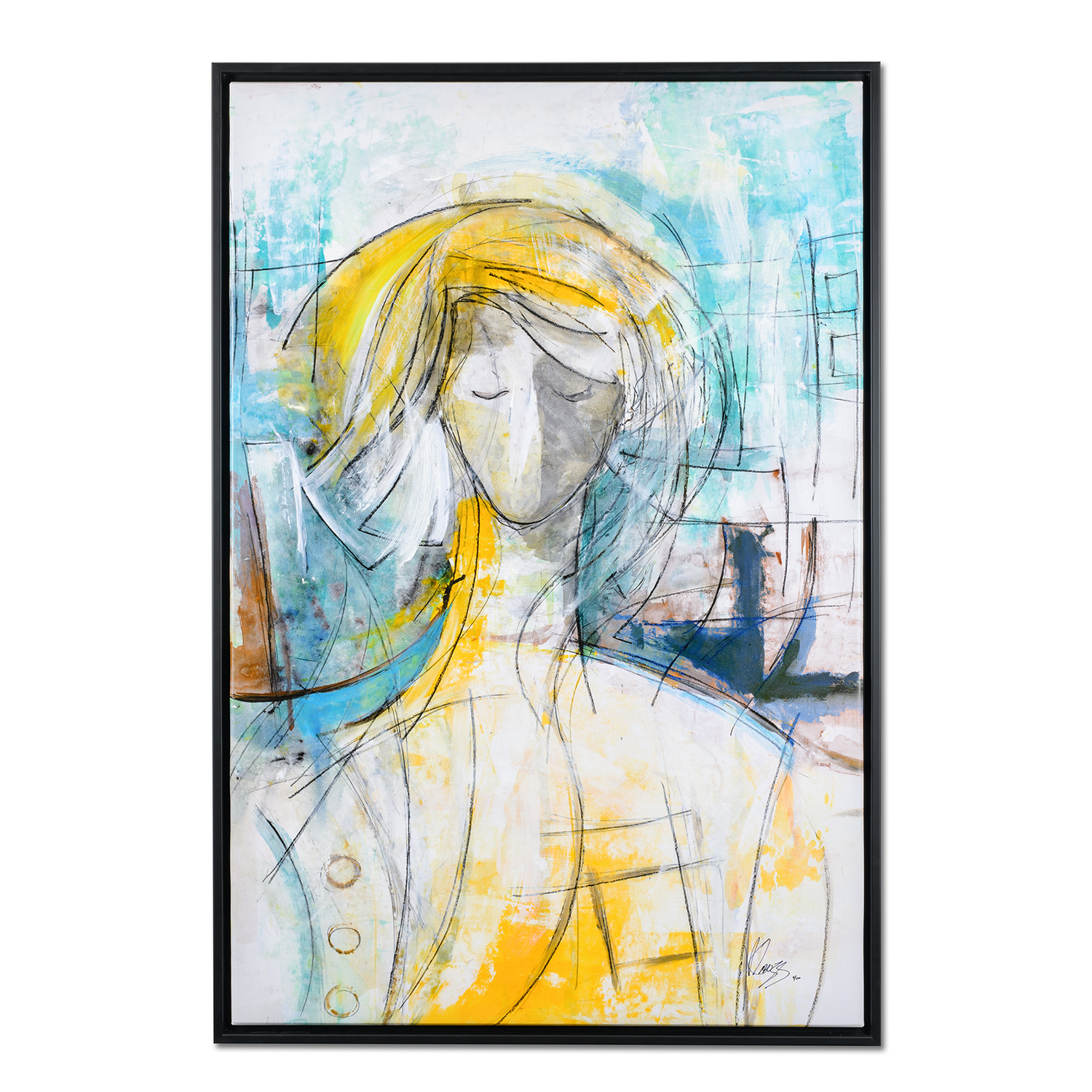 [0] => The Sun Washed Painting, by V. Klauss, is an abstract cubist portrait that plays with perspective and dimension. Muted tones of gold, blue, brown, and grey wash this painting in gentle color, and the subject's closed eyes contribute to the calm, peaceful atmosphere. The canvas is mounted in a black floater frame.