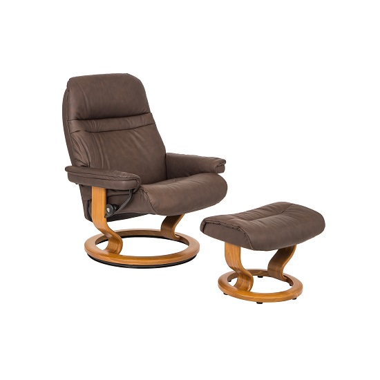 [0] => The Sunrise Large Chair and Ottoman, designed by Ekornes of Norway, has an open, welcoming design with cutting edge comfort technology. Sunrise features the Stressless Plus™ and Glide systems, which allow the chair to provide continuous support for the head and lower back, while also adjusting the reclining angle based on shifts of the body. Available with a classic teak base and chocolate Paloma leather upholstery, this piece has softly-rounded contours that create a supremely comfortable, supported space for reading, resting, or even watching the sunrise!