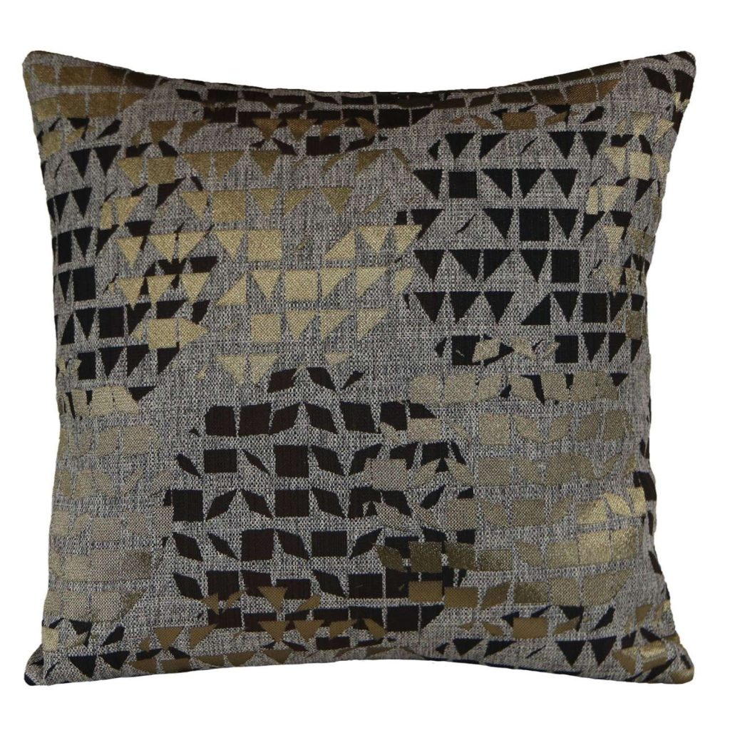 The Supernova Pillow features a jazzy design with overlapping squares and diamonds arranged in circular formations. Gold thread creates a lustrous accent against darker shades of brown and taupe. A feather filling gives this pillow a satisfying plumpness, while a discreet zipper allows the cover to be removed for spot-cleaning if needed.