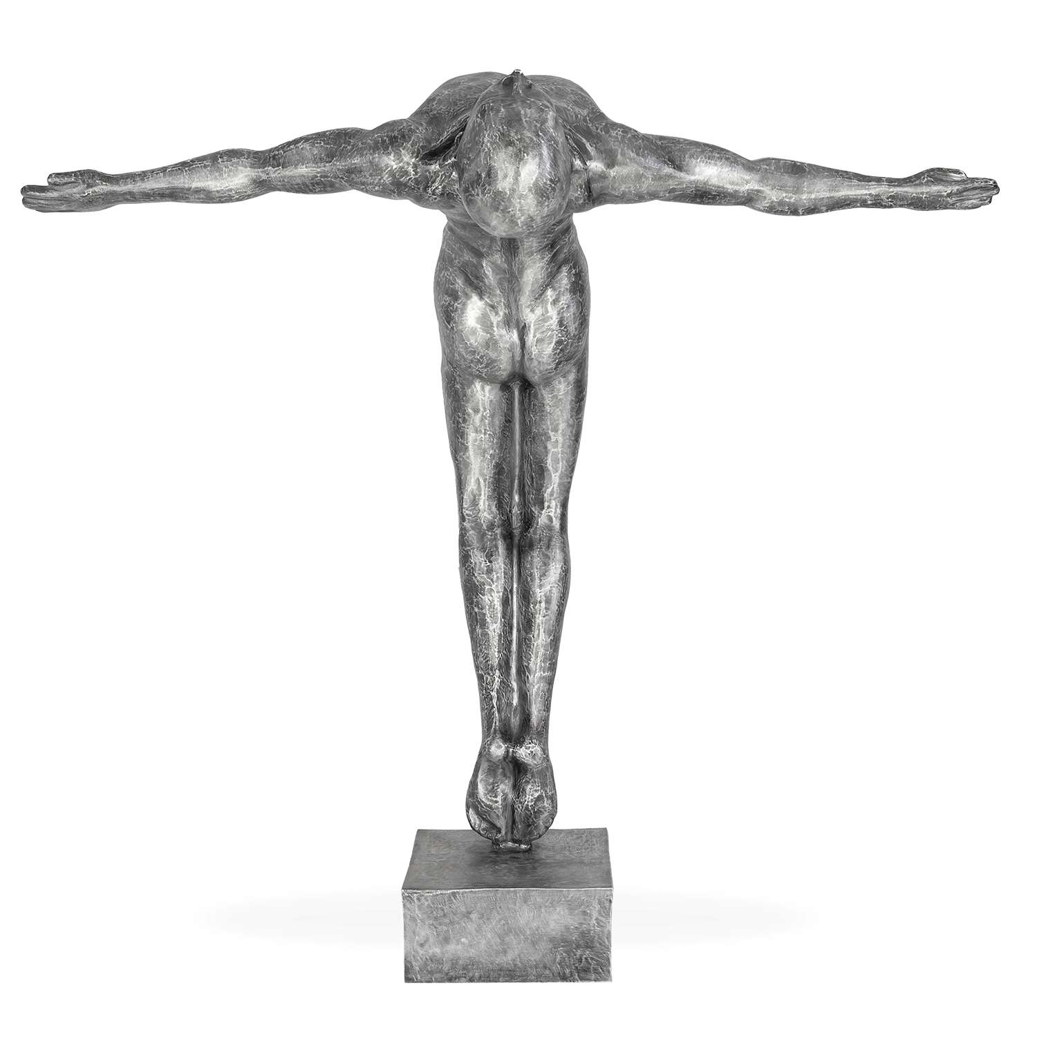 The Swim Swallow Sculpture is a stunningly dynamic work depicting a life-size human figure with their arms outstretched and their back deeply arched as they balance on their toes. This sculpture is wrought from aluminum with a lightly distressed finish and stands on a rectangular base. Suitable for indoor or outdoor use, Swim Swallow is perfect for sports enthusiasts and lovers of modern sculpture.