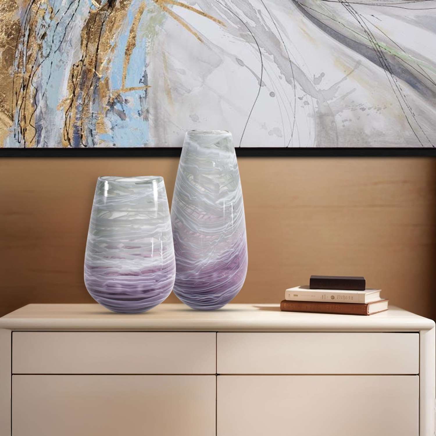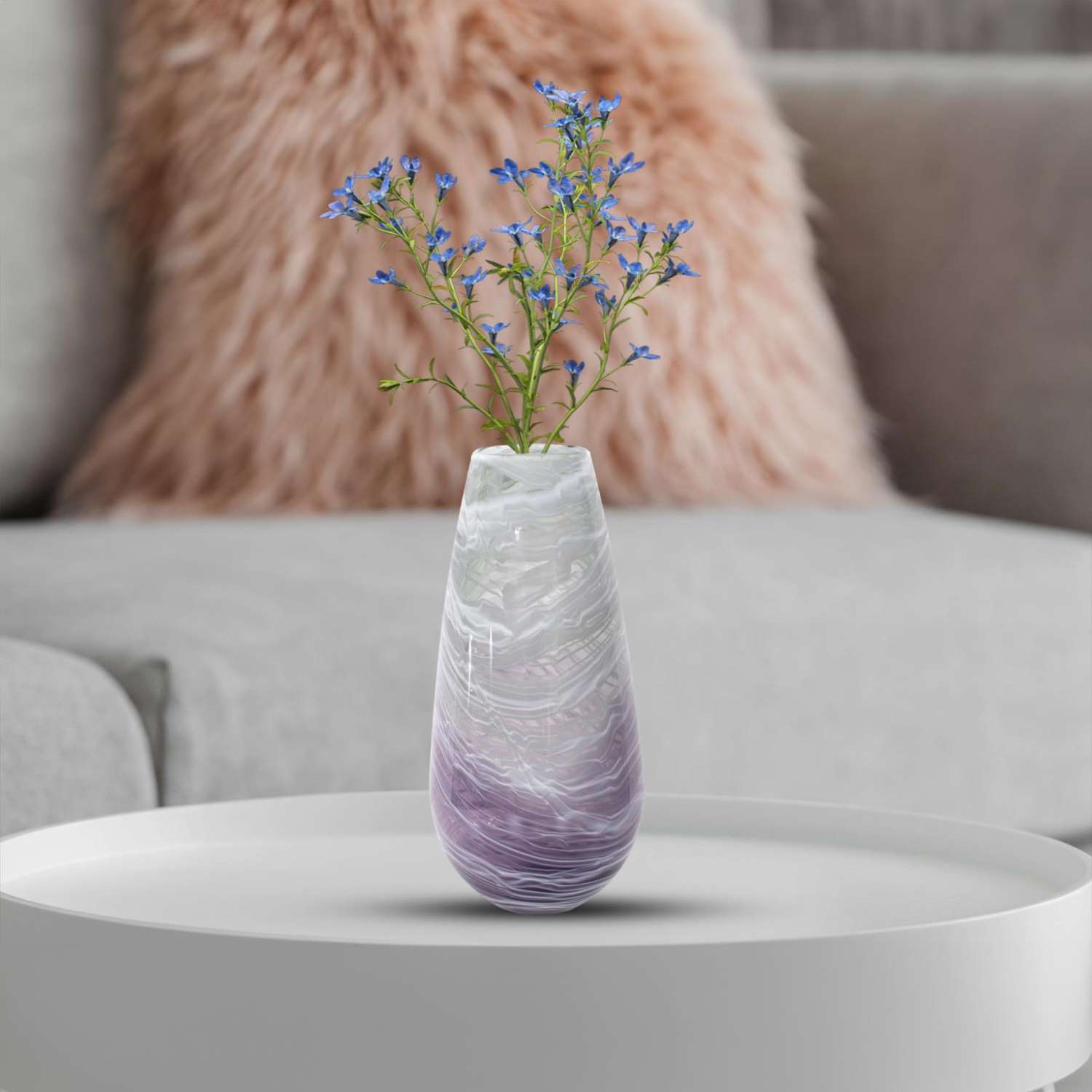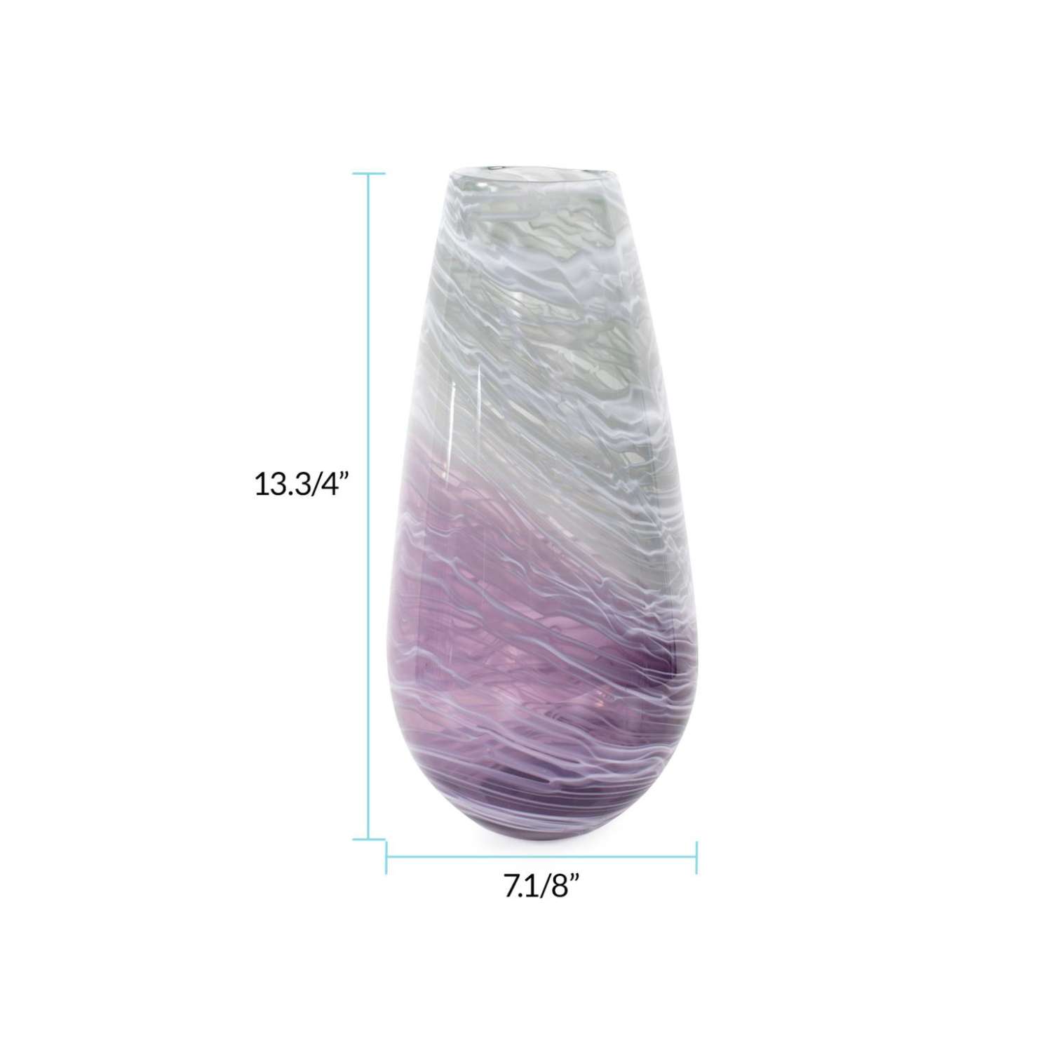 [0] => The Swirled Torpedo Tall Vase is hand-blown from glass in an elongated teardrop shape. Its soft hues of lavender and grey are accented with a dreamy, swirled pattern in white that infuses this piece with a calm yet dynamic feel. Fill with flowers or pair with the Swirled Torpedo Short Vase to add a delicate touch to your interior.