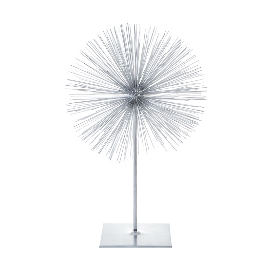 [0] => The Tall Spike Sculpture features a cluster of metal spikes arranged in a spherical shape, reminiscent of an exploding firework, captured in midair and suspended by a slim silver base. Whether by itself or arranged in multiples, the Spike sculpture will bring a dynamic, three-dimensional accent to your living or office space.