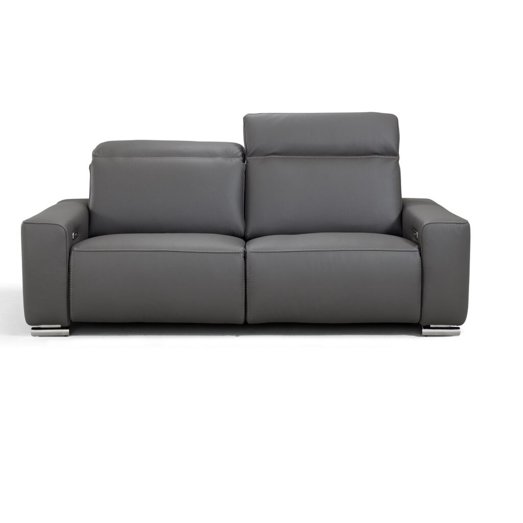 [0] => tammy 2 seat power motion sofa 84" long. dual power in both seat and headrest. leather 1068 grey with contrast stitch in lighter grey. chrome feet.