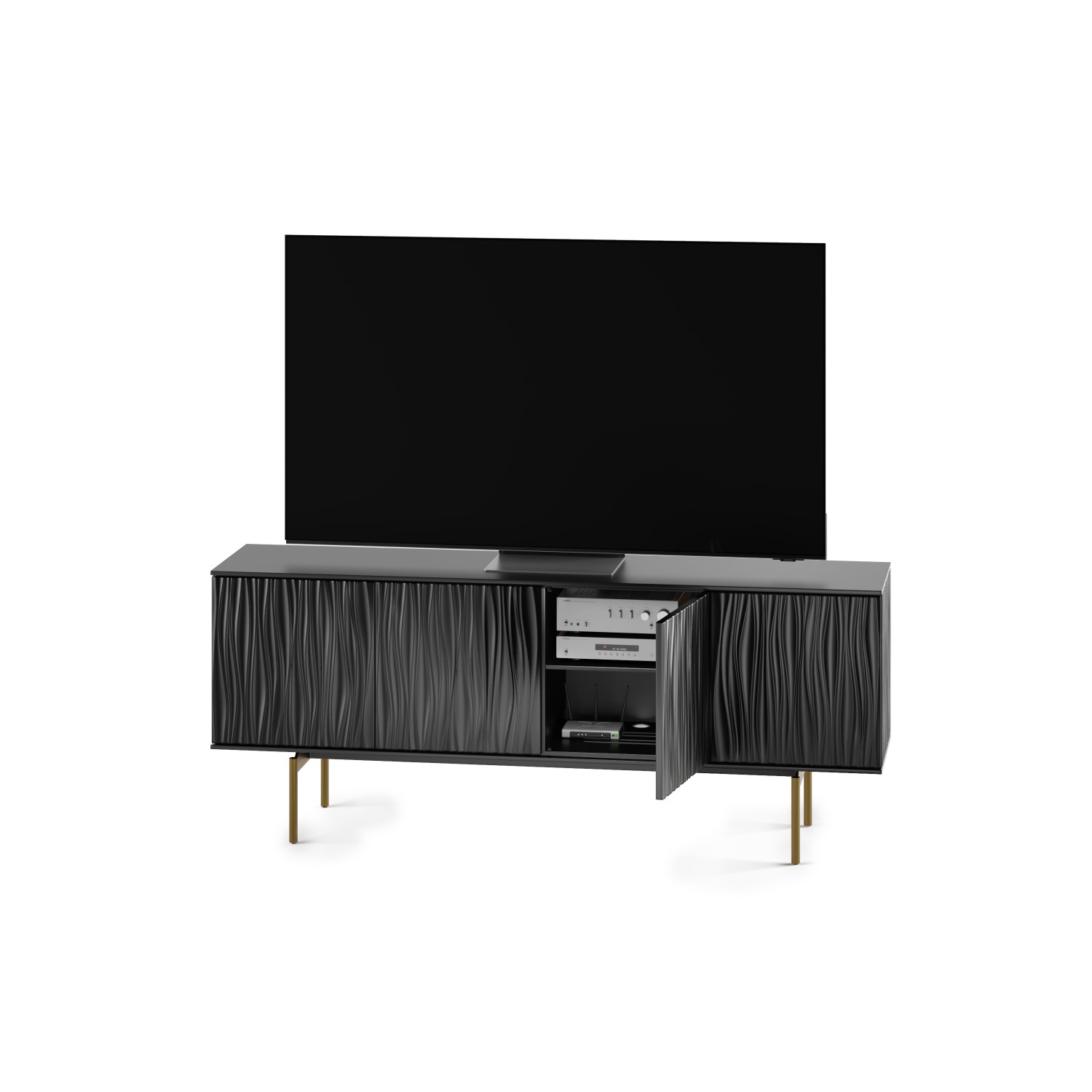 [0] => The Tanami Credenza by BDI is a stunning storage cabinet and media console featuring sculpted satin black doors and attractive metal legs with a bronze finish. Pairing clean lines with flowing patterns, Tanami easily stores belongings in your entryway, hallway, living room, or dining room -- or functions as a media cabinet. Push-to-open doors discreetly conceal four compartments with adjustable shelves, while cutouts in the back of the cabinet help organize wires and cables. Thoughtfully designed with flow-through ventilation that keeps electronics cool, Tanami also includes a TV strap that can safely anchor a TV up to 85". With its unique, functional design, Tanami will be an object of admiration and conversation in your home.