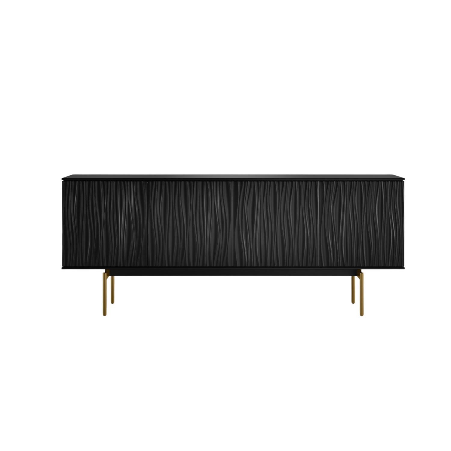 The Tanami Credenza by BDI is a stunning storage cabinet and media console featuring sculpted satin black doors and attractive metal legs with a bronze finish. Pairing clean lines with flowing patterns, Tanami easily stores belongings in your entryway, hallway, living room, or dining room -- or functions as a media cabinet. Push-to-open doors discreetly conceal four compartments with adjustable shelves, while cutouts in the back of the cabinet help organize wires and cables. Thoughtfully designed with flow-through ventilation that keeps electronics cool, Tanami also includes a TV strap that can safely anchor a TV up to 85". With its unique, functional design, Tanami will be an object of admiration and conversation in your home.