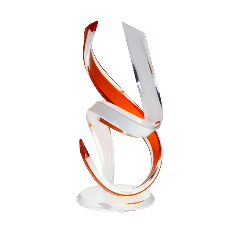 [0] => The Tango Acrylic Sculpture brings whimsical, abstract shapes and vibrant color to your home. The perfect minimalist accent to any space, Tango features a curved design with hidden angled facets throughout the structure. The orange coloring mixes in with the glass seamlessly, creating a watercolor effect.