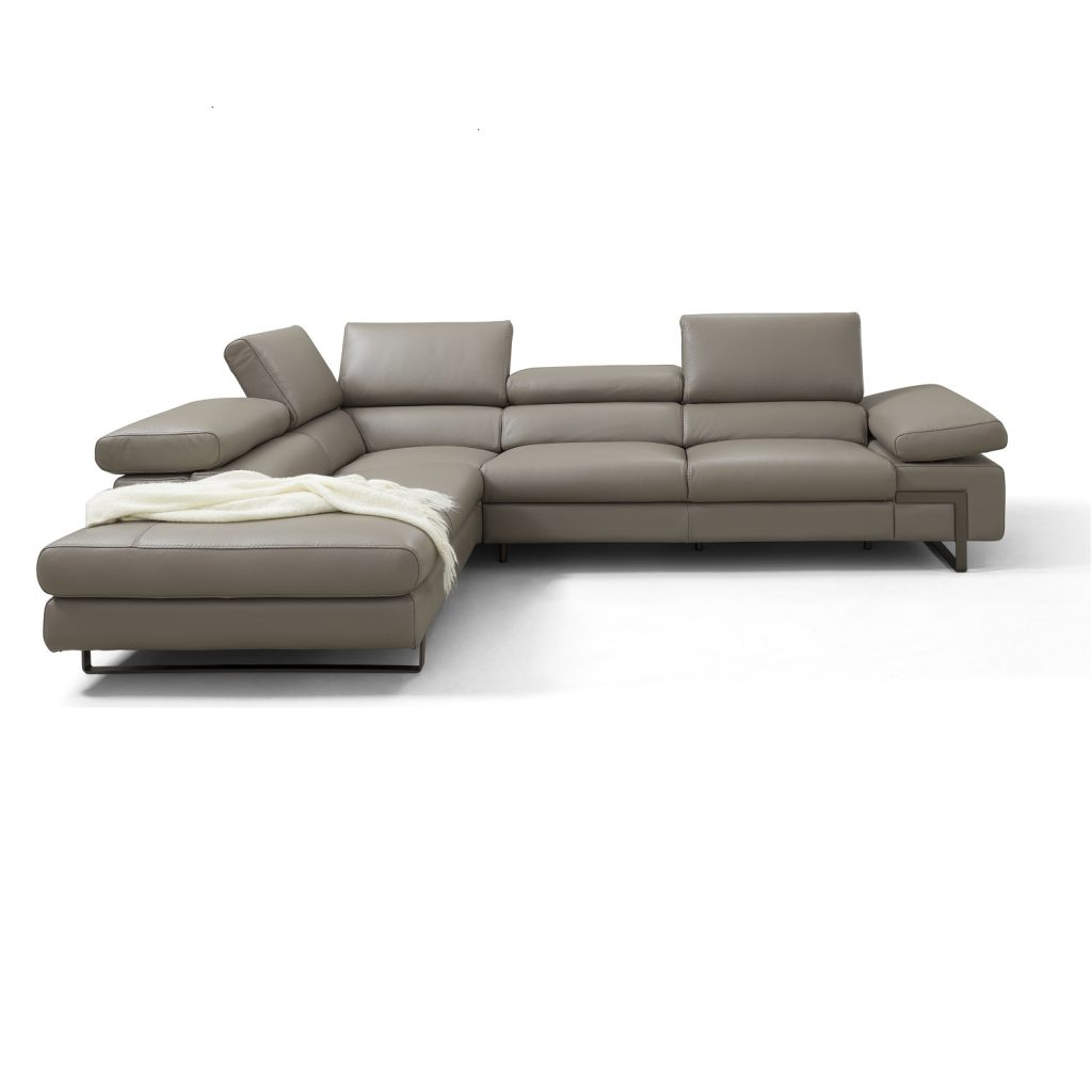 The Tanya Sectional, available in neutral taupe top-grain leather, features bright metal accents and broad, wide cushions which create clean lines and exceptional comfort. With manually-adjustable backs and headrests, one spacious arm rest, and one open arm, this sectional brings comfort in any position.