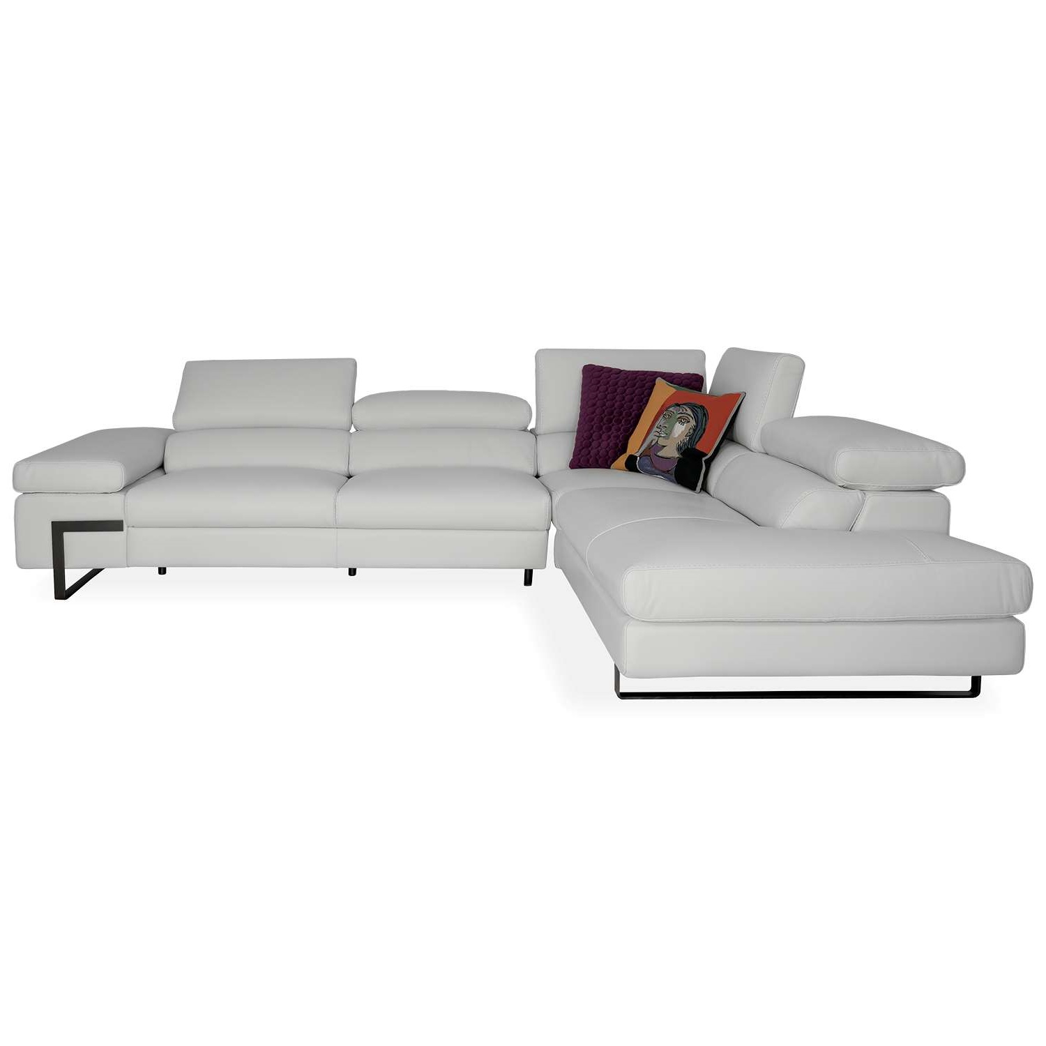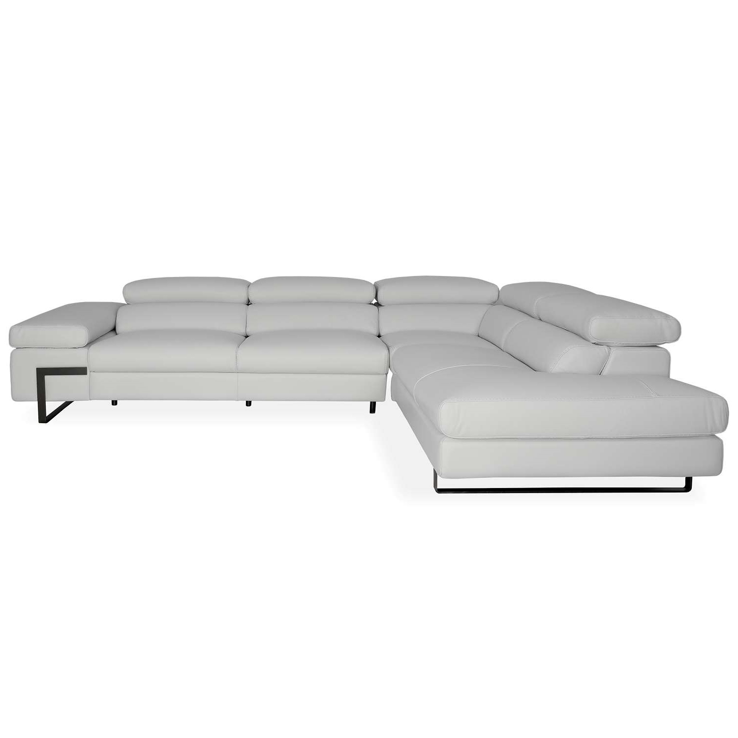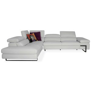 The Tanya Sectional, available in white top-grain Giotto leather, is at once classic and contemporary, with a sprawling structure that offers exceptional comfort. Tanya's broad, wide cushions include one spacious arm rest and one open arm, as well as five manually adjustable headrests that allow you to customize your comfort. Satin metal legs enhance Tanya's structured feel.
