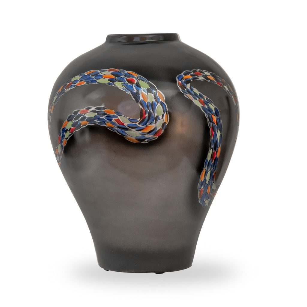 Made of porcelain, the Tarifa Vase features a titanium grey surface embellished with a striking design. Daubs of blue, green, red, and orange paint are hand-applied in the outlines of curved forms that evoke braided rope or the sinuous bodies of snakes. With its large size and rounded urn shape, Tarifa will add a unique accent to a contemporary home or office.