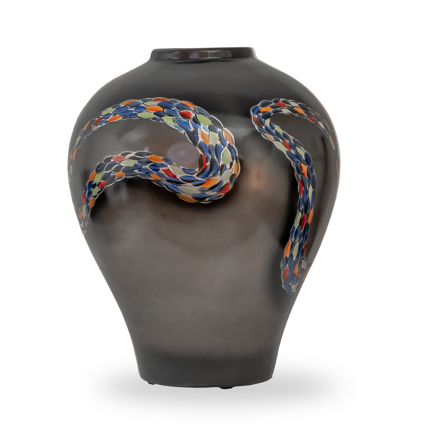 [0] => Made of porcelain, the Tarifa Vase features a titanium grey surface embellished with a striking design. Daubs of blue, green, red, and orange paint are hand-applied in the outlines of curved forms that evoke braided rope or the sinuous bodies of snakes. With its large size and rounded urn shape, Tarifa will add a unique accent to a contemporary home or office.