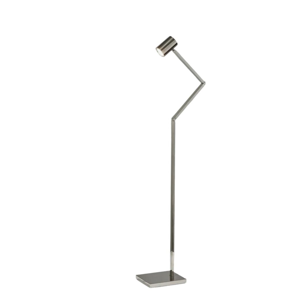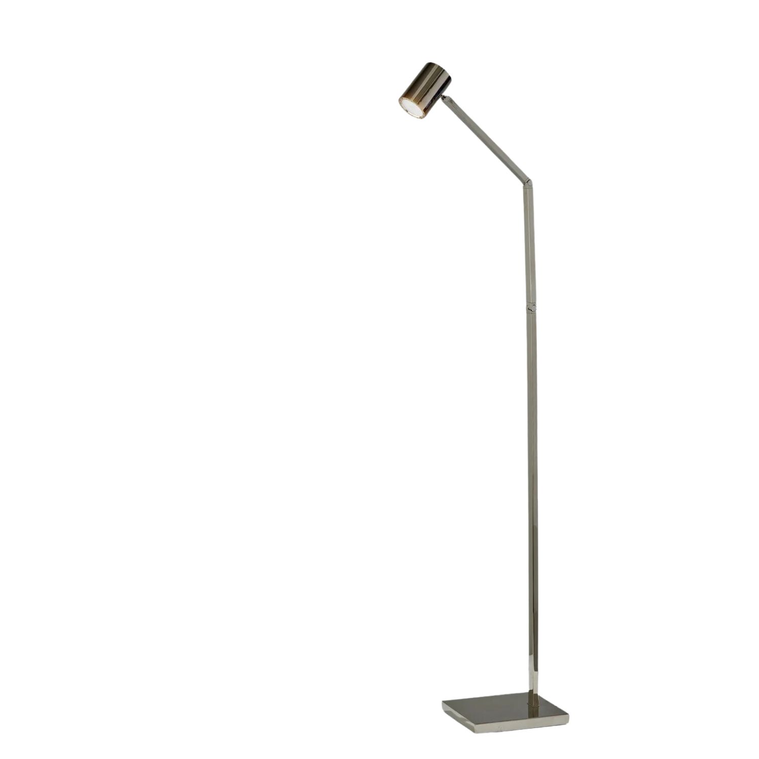 Ideal for an office, den, or study corner, the Task Floor Lamp has a flexible, streamlined design and modern look. Made of aluminum with a polished nickel finish, this lamp has a small, round shade that provides focused light as well as a slim frame that bends in two places, allowing you to adjust the angle of illumination. Supported by a weighted rectangular base, the Task Floor Lamp runs on a 7W replaceable LED and has a touch switch with three brightness settings for your convenience.