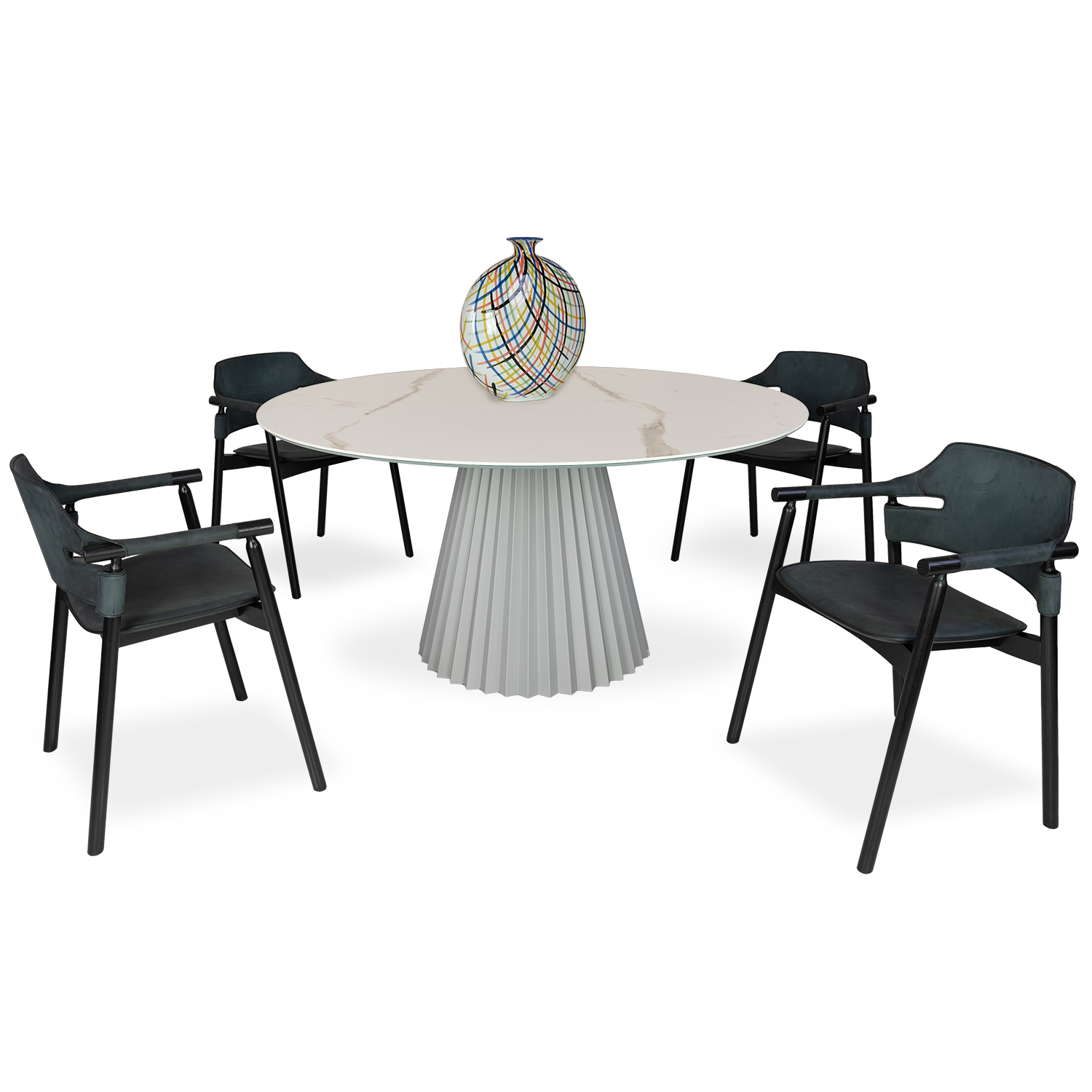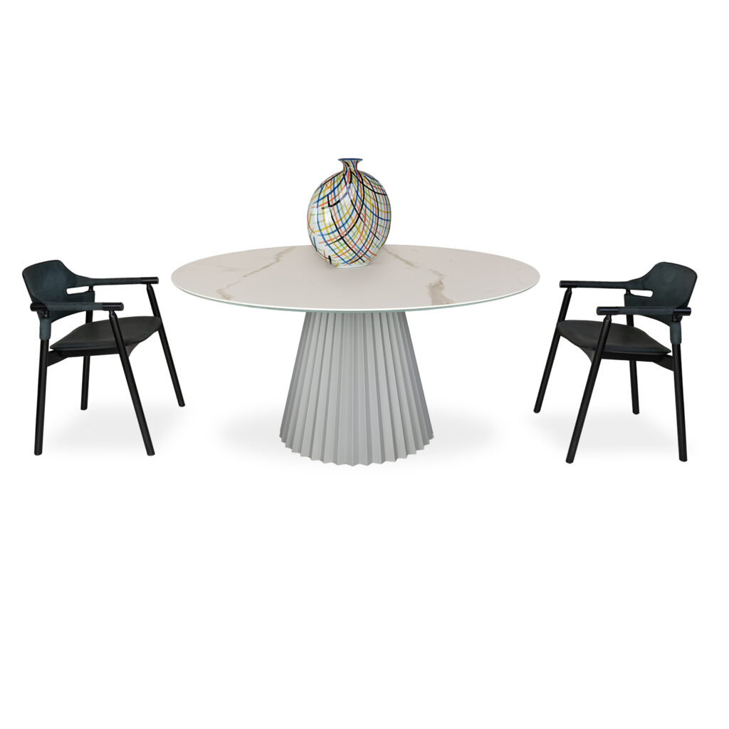 [0] => Designed in Italy by Paola Navone, the Tavolo Plisse Dining Table sports a unique form inspired by pleated fashions of the 50's and 60's. Tavolo Plisse has a round tabletop in matte white Calacatta ceramic marble with grey veining, supported by a pleated conical base in light grey lacquered steel. With its striking blend of luxe textures and neutral tones, Tavolo Plisse is an inspired choice for eclectic yet elegant contemporary dining spaces.