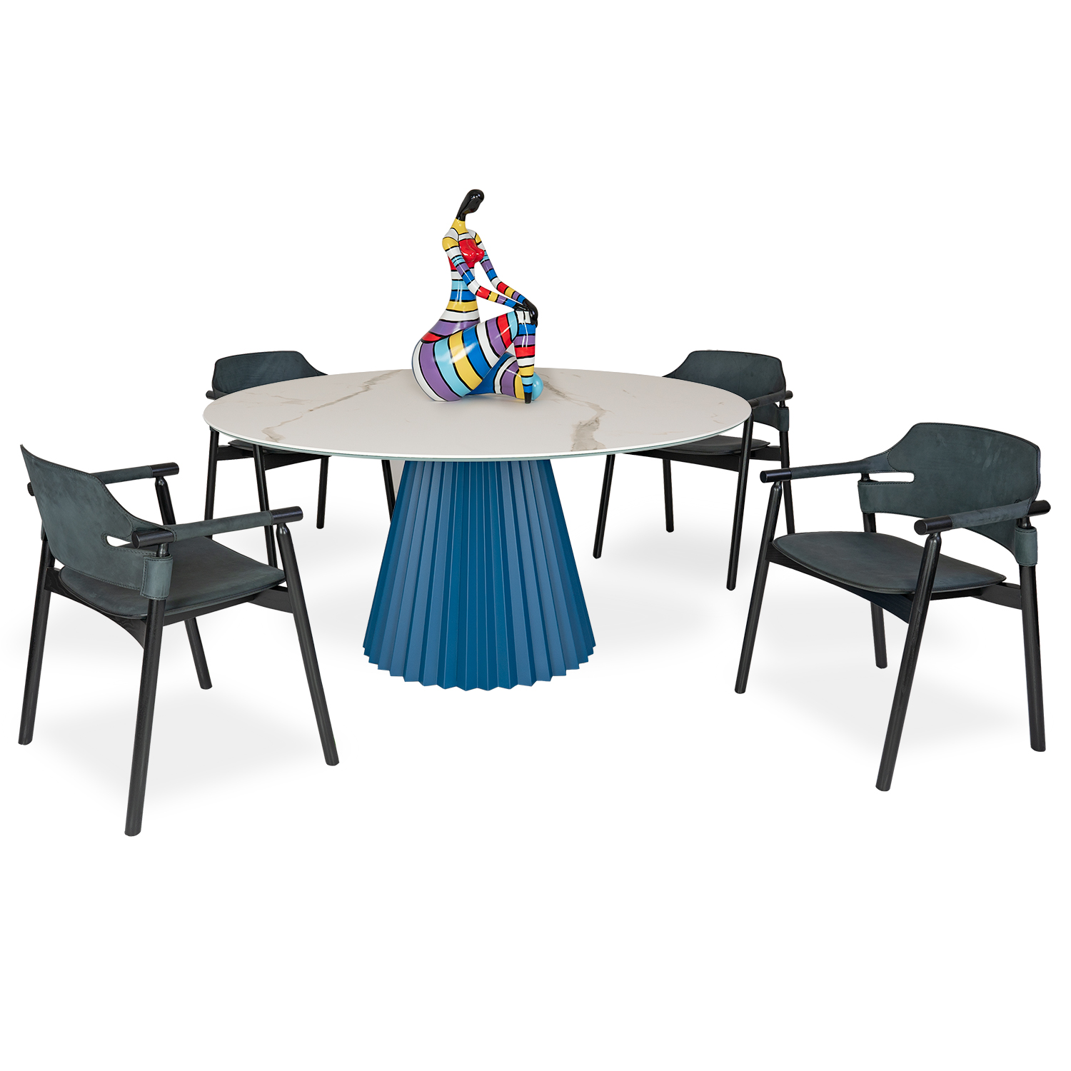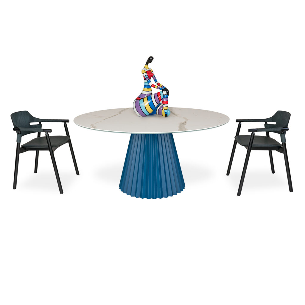 [0] => Designed in Italy by Paola Navone, the Tavolo Plisse Dining Table sports a unique form inspired by pleated fashions of the 50's and 60's. Tavolo Plisse has a round tabletop in matte white Calacatta ceramic marble with grey veining, supported by a pleated conical base in ocean blue lacquered steel. With its striking interplay of textures and colors, Tavolo Plisse is an inspired choice for eclectic yet elegant contemporary dining spaces.