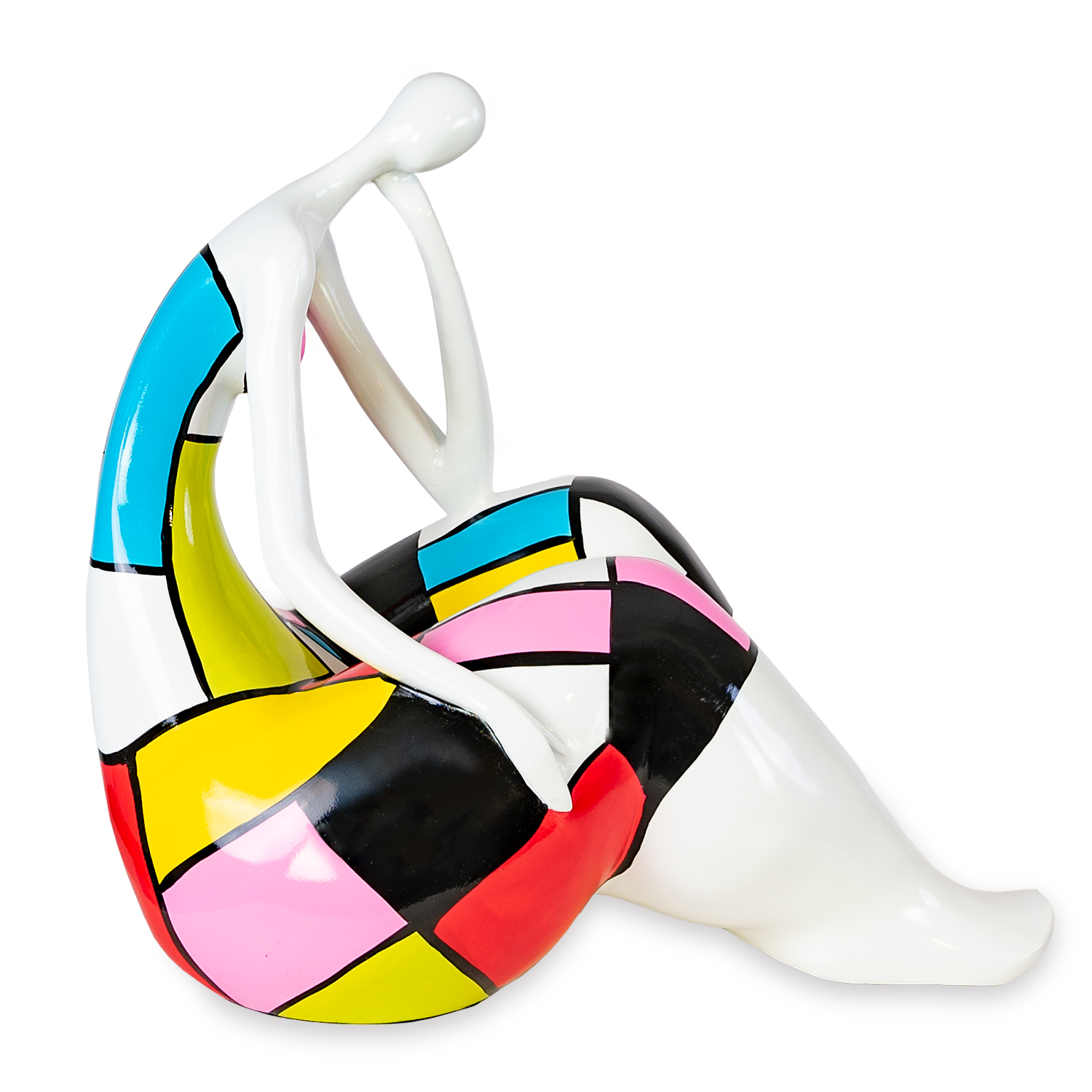 The Awakening Sculpture depicts a woman sitting in a pensive position with her head leaning on one hand. A geometric patchwork of pink, blue, green, red, yellow, and black rectangles embellish the woman's stylized form for a colorful blend of pop art, abstract art, and contemporary sculpture.