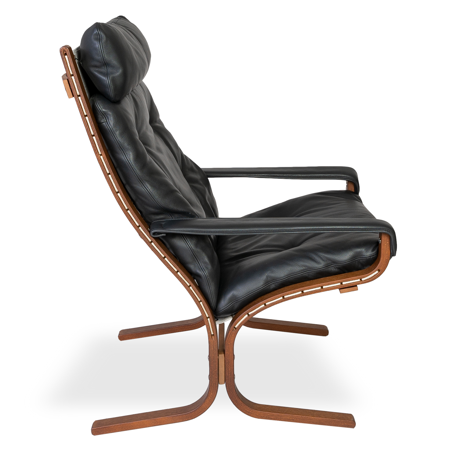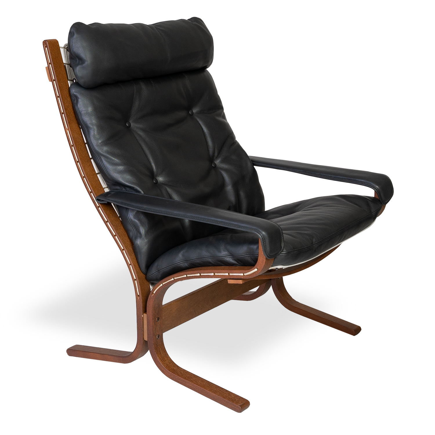 [0] => Designed in 1965 by Norwegian icon Ingmar Relling, the Siesta Highback Chair features blissfully soft cushioning and a lightweight frame. Upholstered in black aniline leather, Siesta's seat and back cushions have an inviting tufted design, while its neck pillow and armrests provide comfortable support for your head and arms. The canvas and cord structure underneath the cushioning lends additional softness, flexibility, and resilience to this iconic chair. Available with a walnut oak frame, the Siesta Highback Chair will bring mid-century modern style and unparalleled relaxation to any living space.