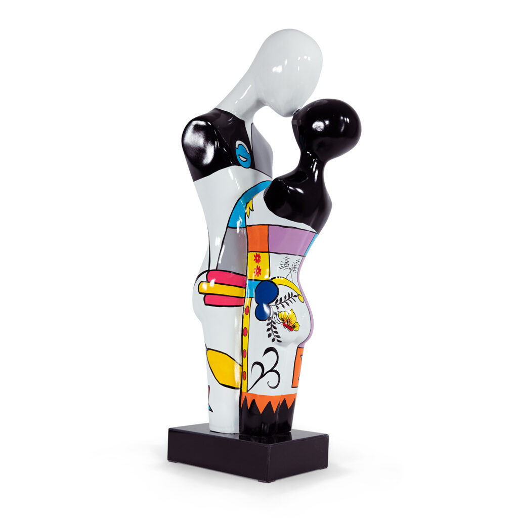 The Lovers Sculpture is vibrant and detailed, depicting two connected figures painted in black and white with bold designs covering their bodies in orange, yellow, red, pink, purple, and blue. Geometric shapes and curved lines highlight their silhouettes and their intimate pose. The Lovers' varied colors makes it easy to integrate this piece into a wide variety of environments and is a subtle way to add a hint of color.