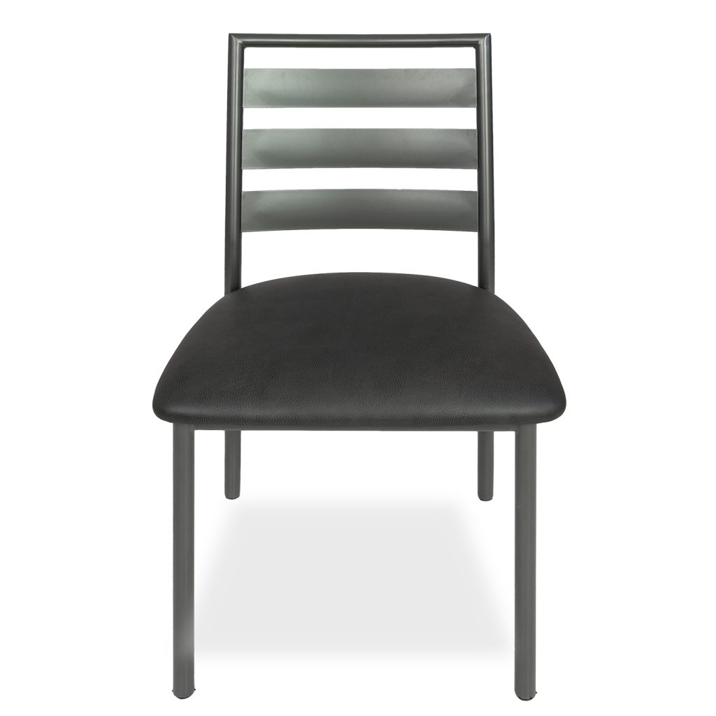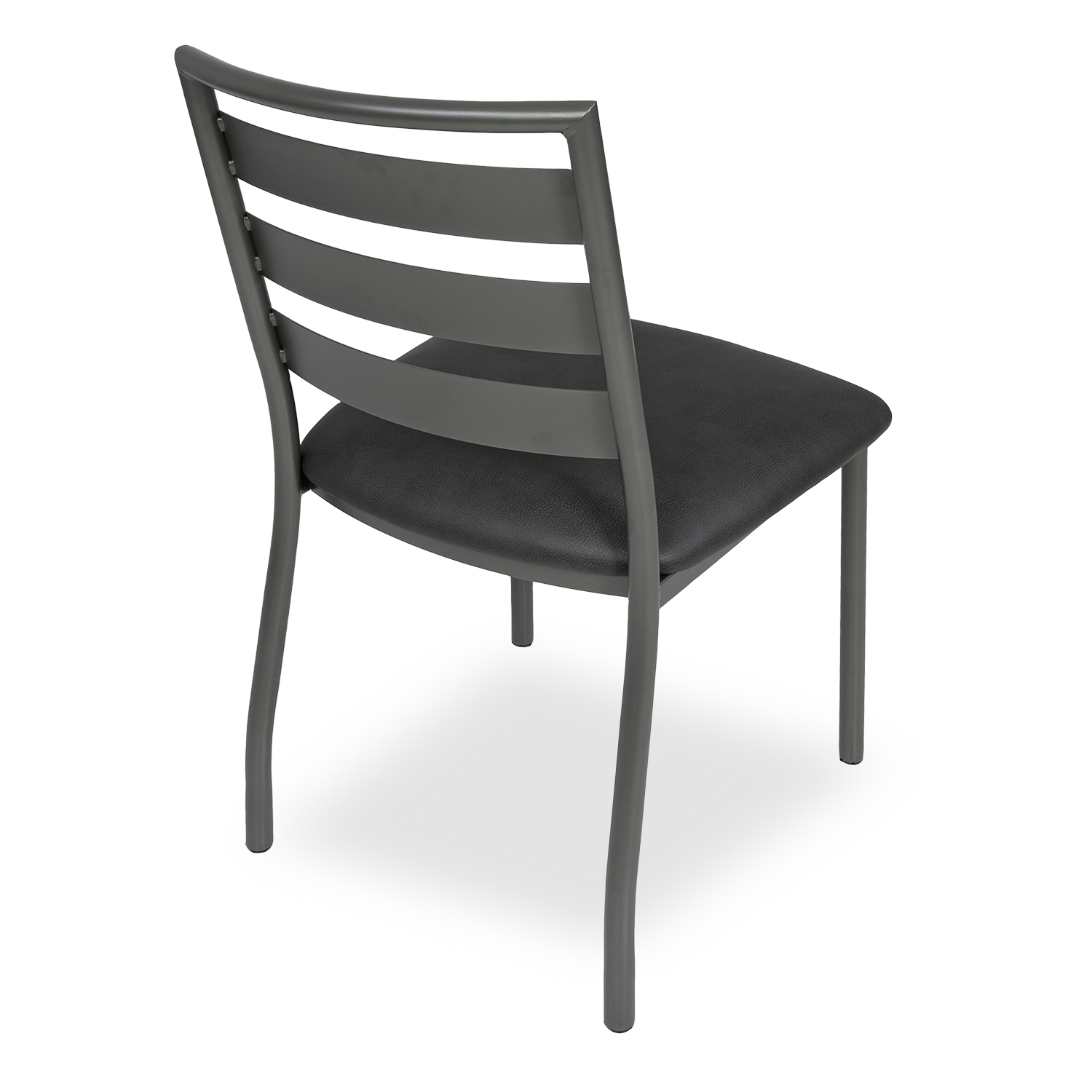 [0] => The Tori Dining Chair has a classic look featuring a backrest with three horizontal bars and back legs that are lightly curved. Tori's grey metal frame has a smooth satin finish, while its seat cushion is upholstered in a medium-grain black leatherette. The baked powder paint that coats the frame is long-lasting and eco-friendly, while the leatherette is tested to withstand over 50,000 double rubs, making Tori suitable for commercial use or many years in your home of cozy breakfasts, lively lunches, and satisfying dinners.