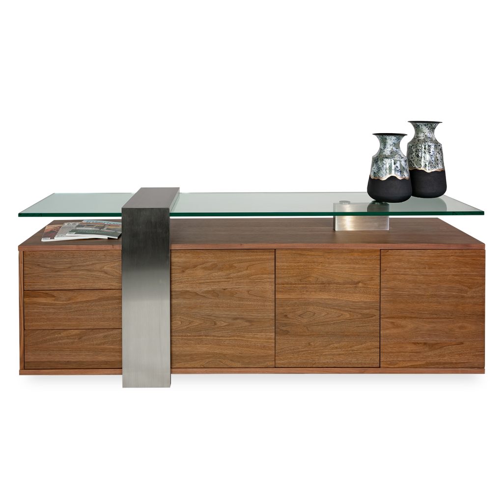 [0] => The Totem Sideboard, available in a walnut finish, is a contemporary sideboard with minimalist lines and a stylish brushed steel frame. Totem conveniently stores everything you need for entertaining with three drawers and three doors that reveal ample space for serveware, linens, and more. The top of the sideboard has a clear glass tabletop that makes it easy to serve your guests in style and display your favorite vases, flowers, and trinkets.