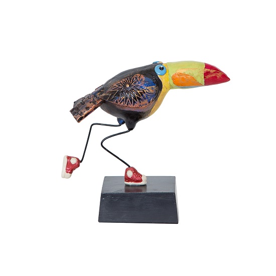 [0] => The Toucan Chick, by artist Steven McGovney, has a fun and quirky personality, with a multicolored body, bright shoes, and a dynamic pose. The Toucan Chick is made of hand-built high-fire ceramic with acrylic, metallic, and oil stain finishes. Place it on your bookshelf, table, or credenza to instantly add charm to any room.