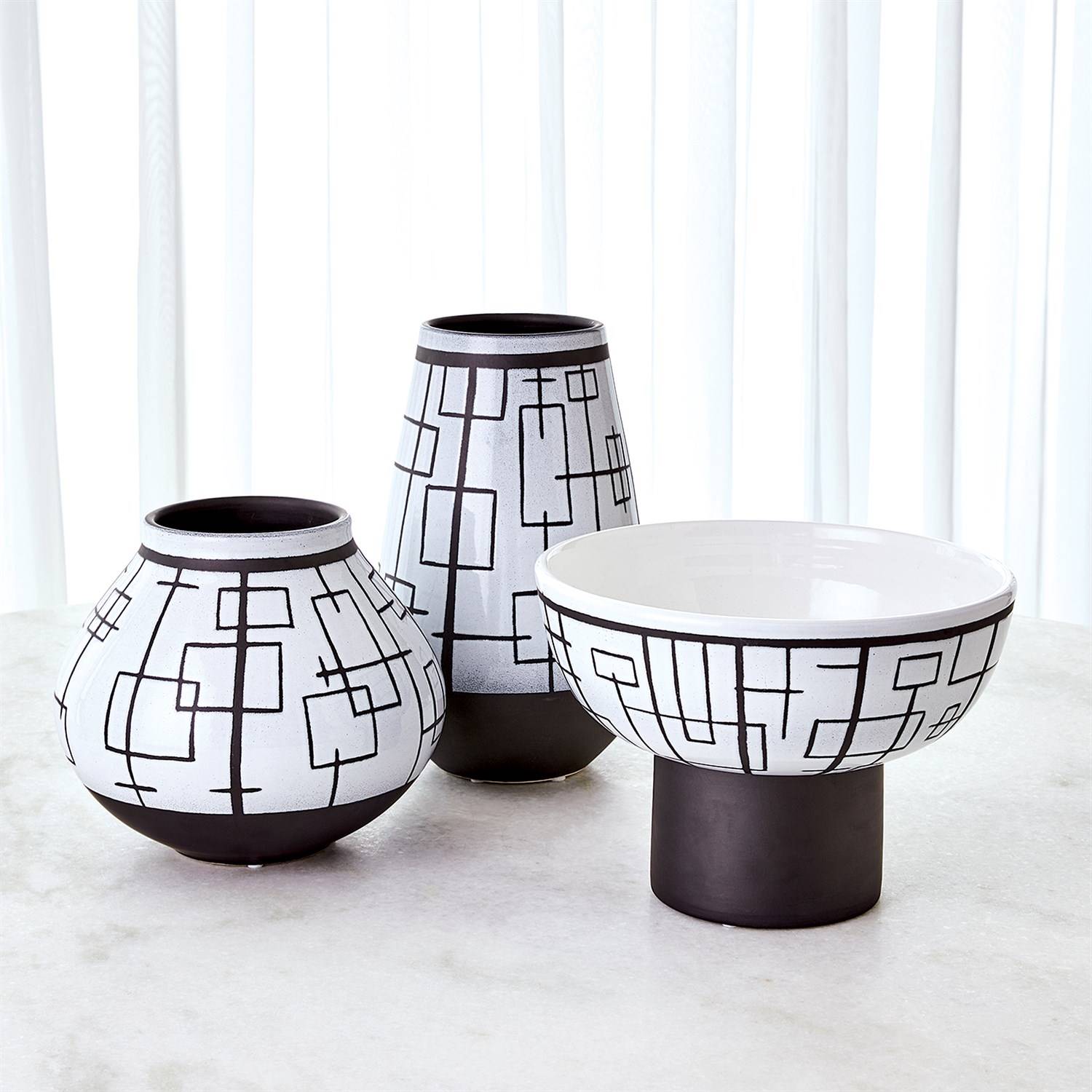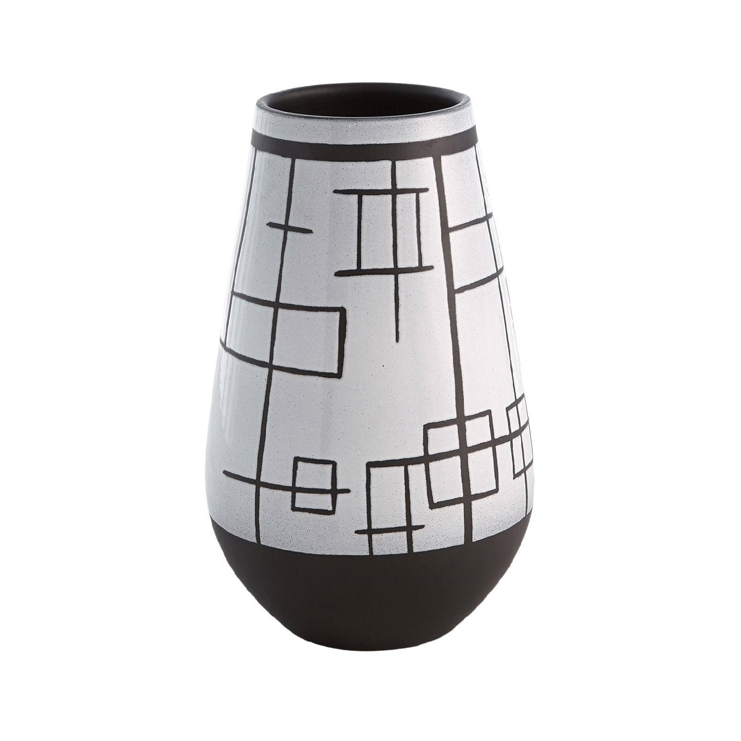Add a mod and funky accent to a table or sideboard with the Large Traverse Vase. It's made of slip cast Italian ceramic with a bold pattern of rectangles and lines etched and painted by hand. Though not watertight, this vase will accentuate a larger artificial flower arrangement or draw the eye simply standing on its own.