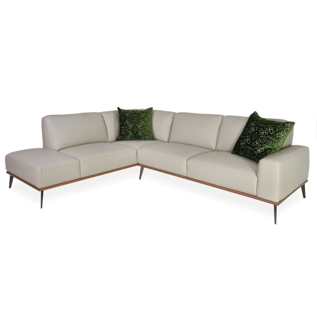 [0] => The Trento Sectional, made in Italy, features rounded lines and plush cushioning that invites hours of relaxation. Upholstered in cream Giotto leather, Trento has four seats and a terminal chaise, all supported by foam and springs for comfort and durability. A walnut base and angled black legs add complementary accents that give this sectional a retro-inspired, yet modern, look.