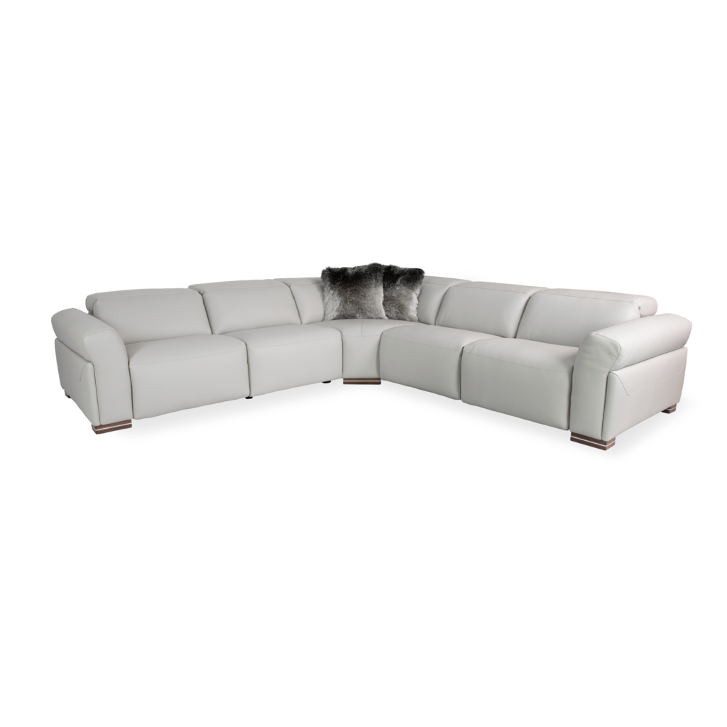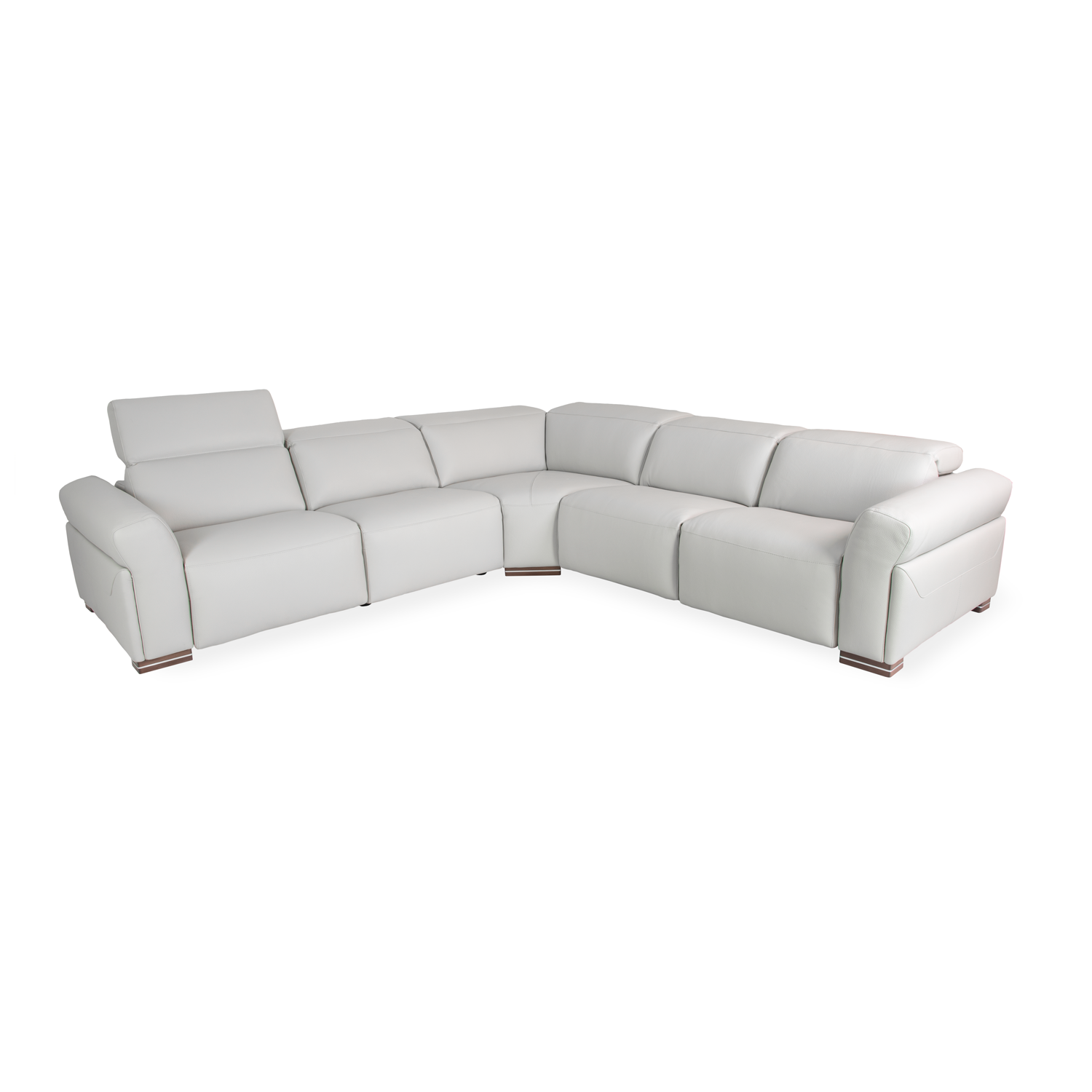 The Treviso Sectional is contemporary and streamlined, with light gray Mason leather upholstery and power motion capabilities that make it easy to relax and get comfortable. Treviso has three power motion seats with adjustable footrests and headrests, while the corner seats feature manually adjustable ratcheting headrests. The wide seats are cushioned and comfortable, and the angled armrests are supportive while adding subtle flair. The silver and walnut finished legs are low and angular, providing contrast against the sectional's lines and color of the pale leather. Treviso's tailored look and adjustable seating makes it the perfect place to sit back and relax.