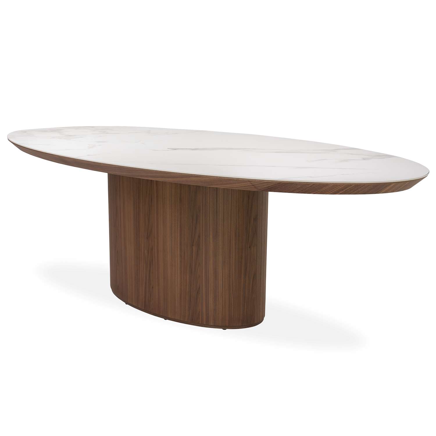 Bring mid-century modern style to your dining room with the Treyton Dining Table, which features an all-around oval structure. This table's Venato white ceramic top has elegant grey marbling and a silky-smooth feel enhanced by its beveled edge and ribbed base, both made of walnut veneer. Treyton's organic form and combination of easy-clean materials gives it an understated look and soft feel that's sure to add elegance to any dining space.