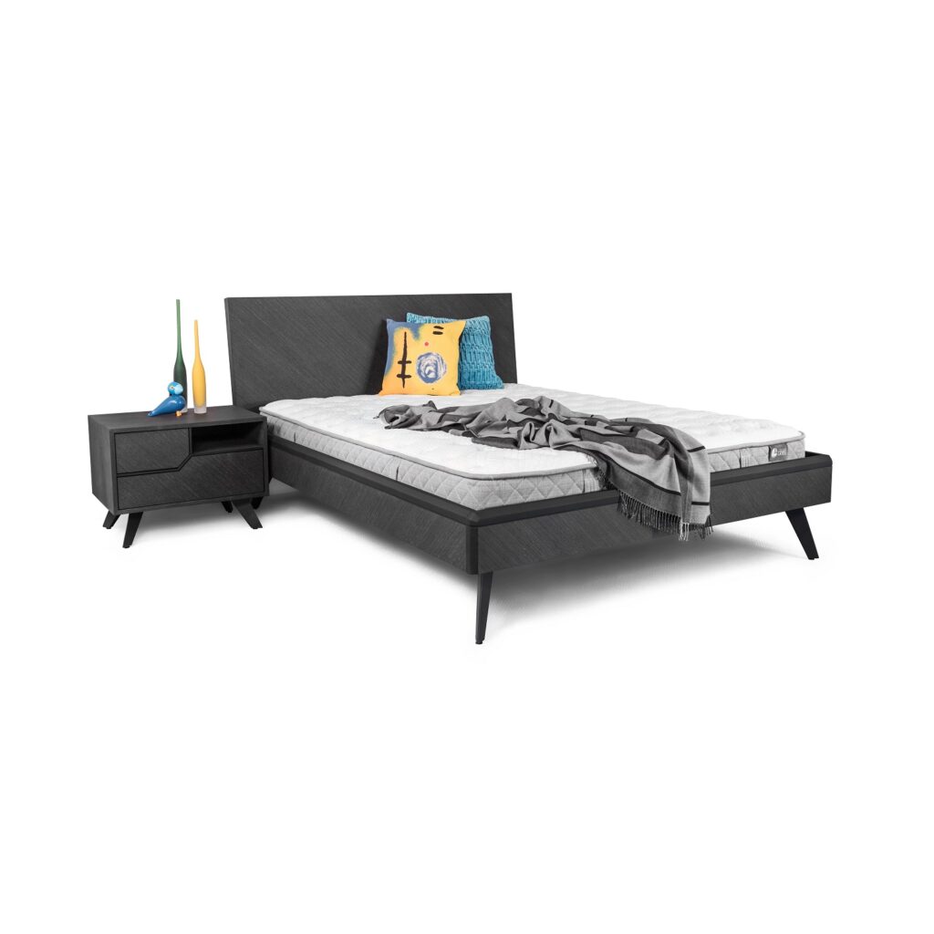 [0] => The Tri bed is a minimalist contemporary bed whose grey veneer and lacquer have a slanting "45 degree" pattern, lending a sense of texture and dimension to its design. Additional items from the Tri bedroom set are available for purchase.