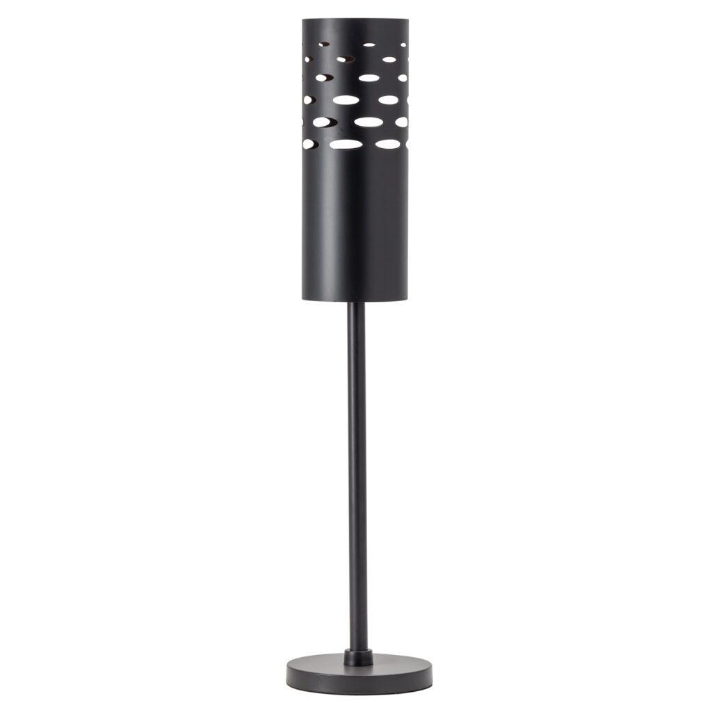 [0] => The Tribeca Buffet Lamp is tall and elegant and features an entirely black metal frame. Precisely cut patterns in the metal allow light to shine through the holes and through the top, while the sleek design creates a artistic look.