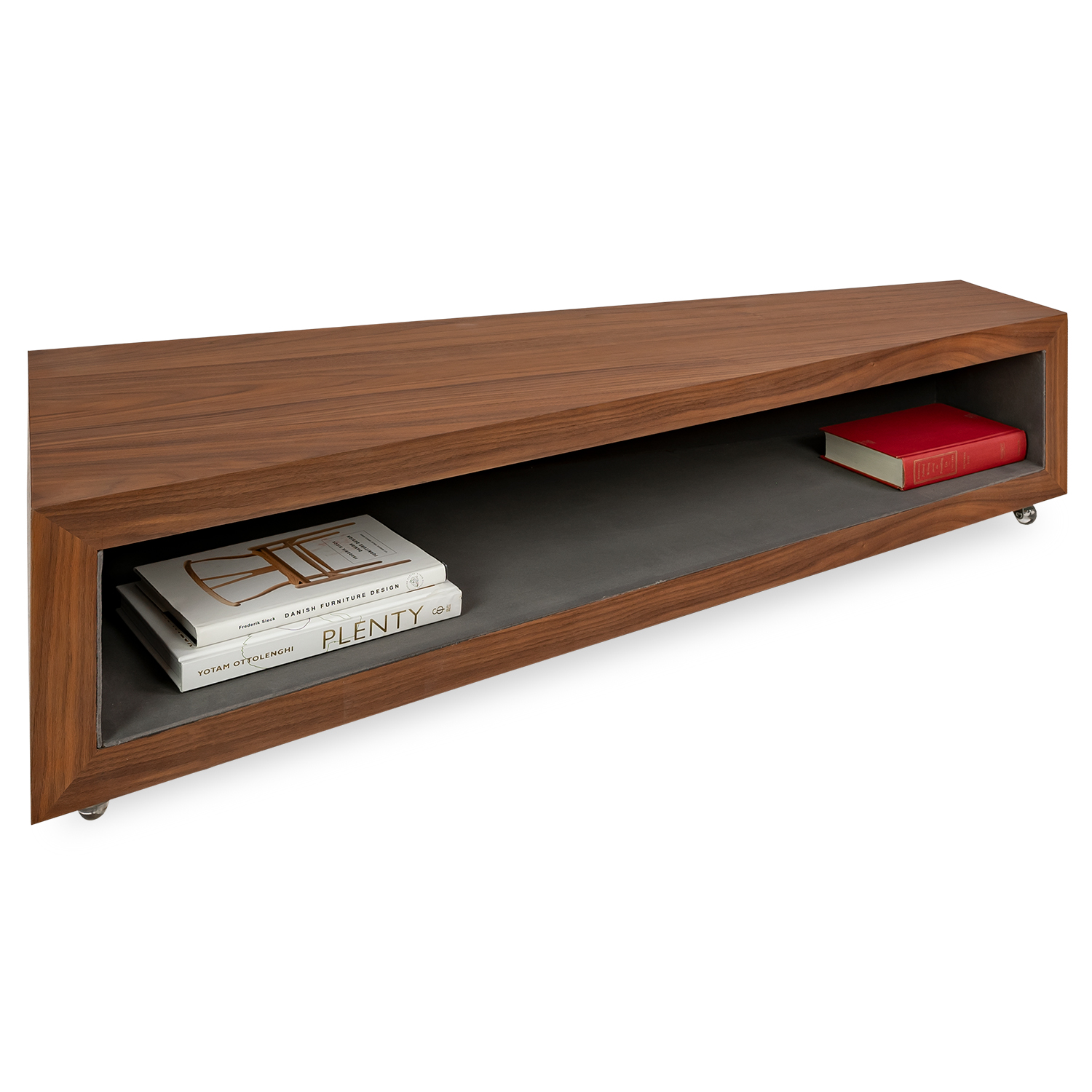The epitome of audacious modern style, the Trojan Triangular Coffee Table features a unique wedge shape in a walnut finish with a grey lined interior. Trojan's open side compartment is ideal for stashing away books, magazines, remotes, and more, while hidden wheels let you easily move this table around your space. Display this unit on its own, or better yet, pair it facing or back-to-back with another Trojan unit in glossy white or yellow for an artistic design accent like no other.