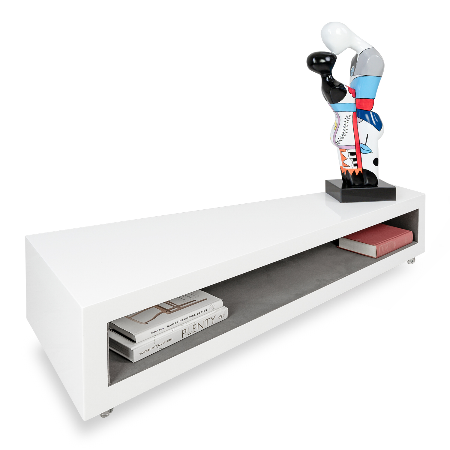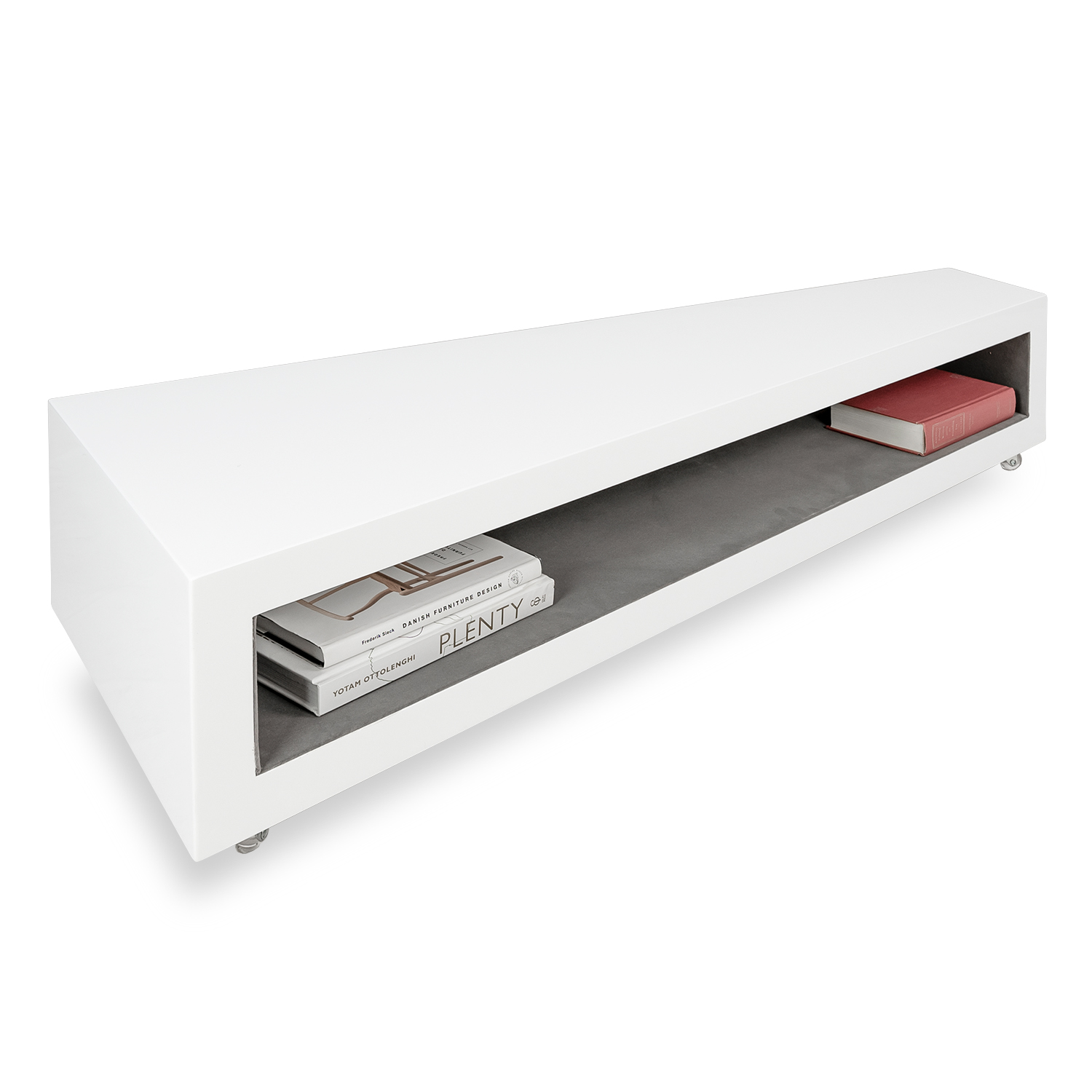 The epitome of audacious modern style, the Trojan Triangular Coffee Table features a unique wedge shape in a glossy white finish with a grey lined interior. Trojan's open side compartment is ideal for stashing away books, magazines, remotes, and more, while hidden wheels let you easily move this table around your space. Display this unit on its own, or better yet, pair it facing or back-to-back with another Trojan unit in walnut or wenge for an artistic design accent like no other.